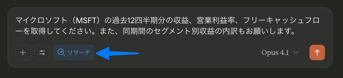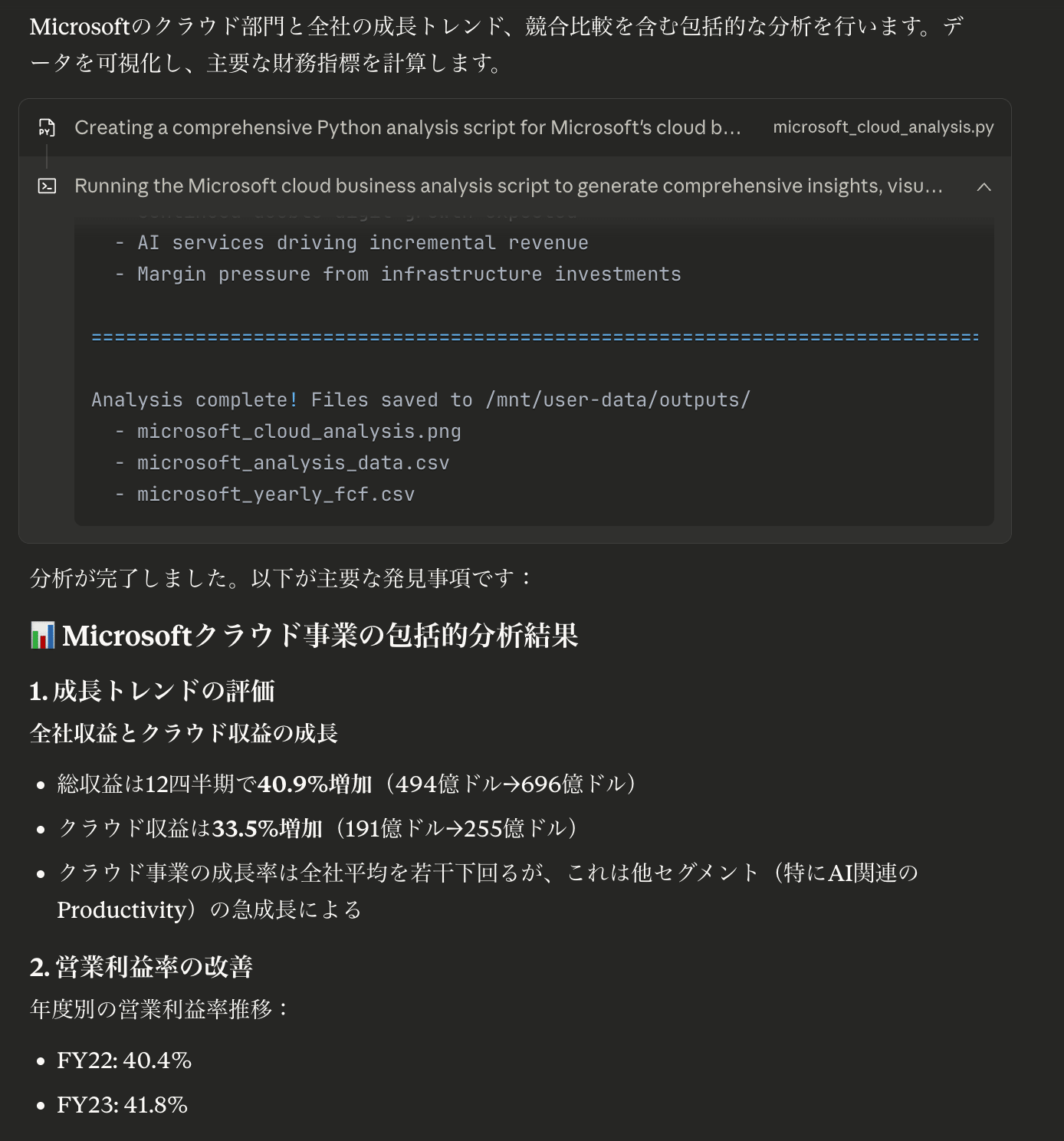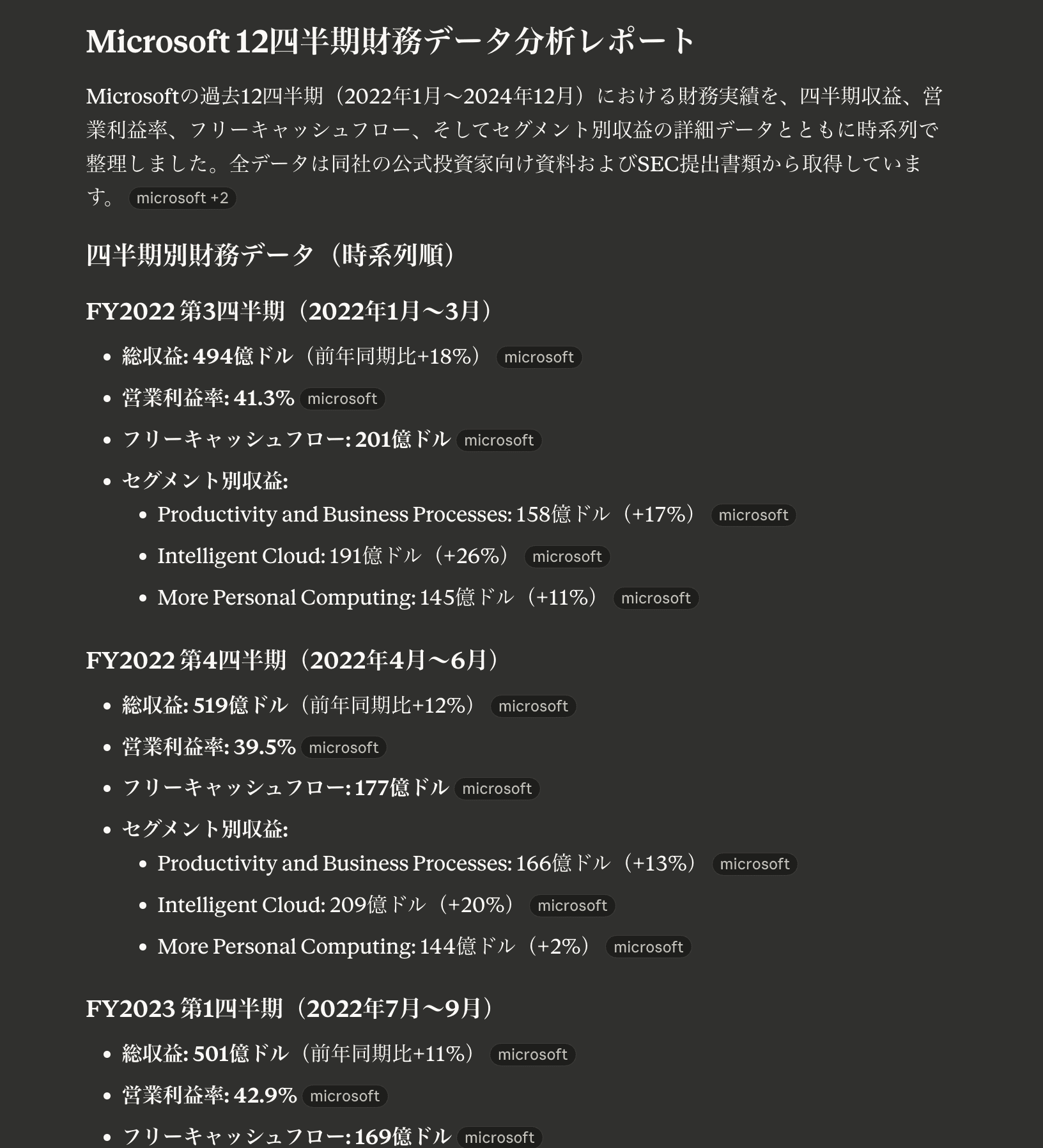 アナリストが行うような専門的な企業分析も、Claudeとの対話で進められます。ここでは例として、マイクロソフトの投資メモをWord形式で作成する流れを見ていきましょう。