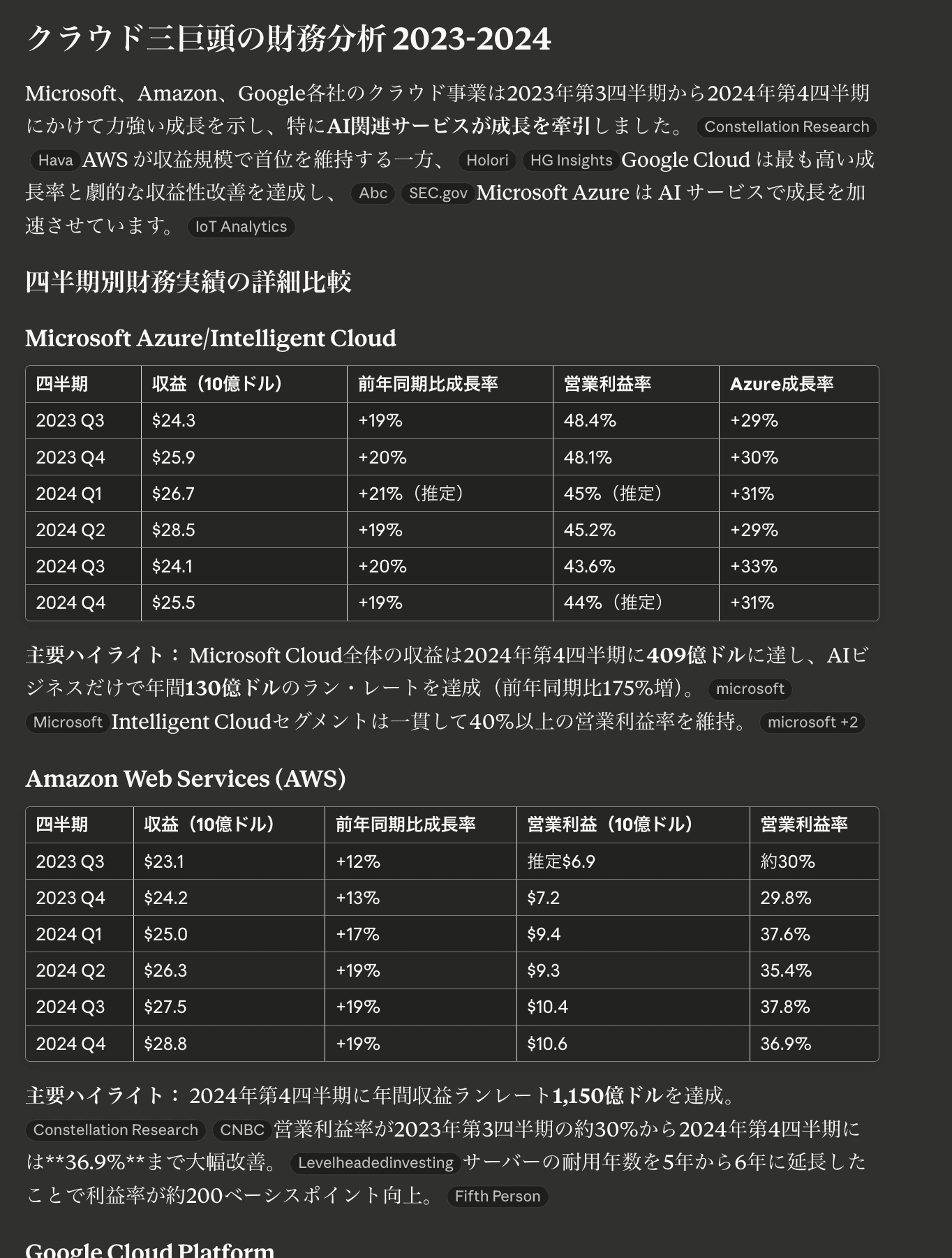 「素晴らしいです。では次に、マイクロソフトの主要な競合他社を特定し、それらの企業の収益成長率と営業利益率を比較用に取得してください。」