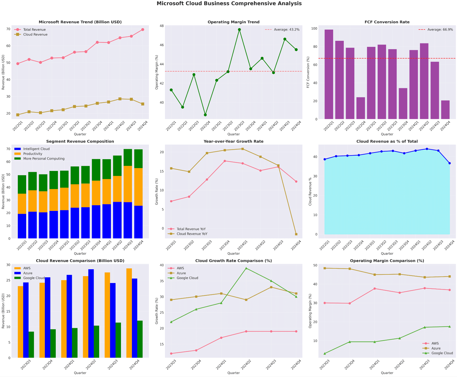 「ありがとうございます。これらのデータから、マイクロソフトのクラウド部門の成長と会社全体の成長のトレンドを分析してください。プログラムを書いてフリーキャッシュフローの変換率を計算し、利益率を前年と比較してください。また、競合他社と比較して、マイクロソフトの相対的なパフォーマンスを評価してください。」
