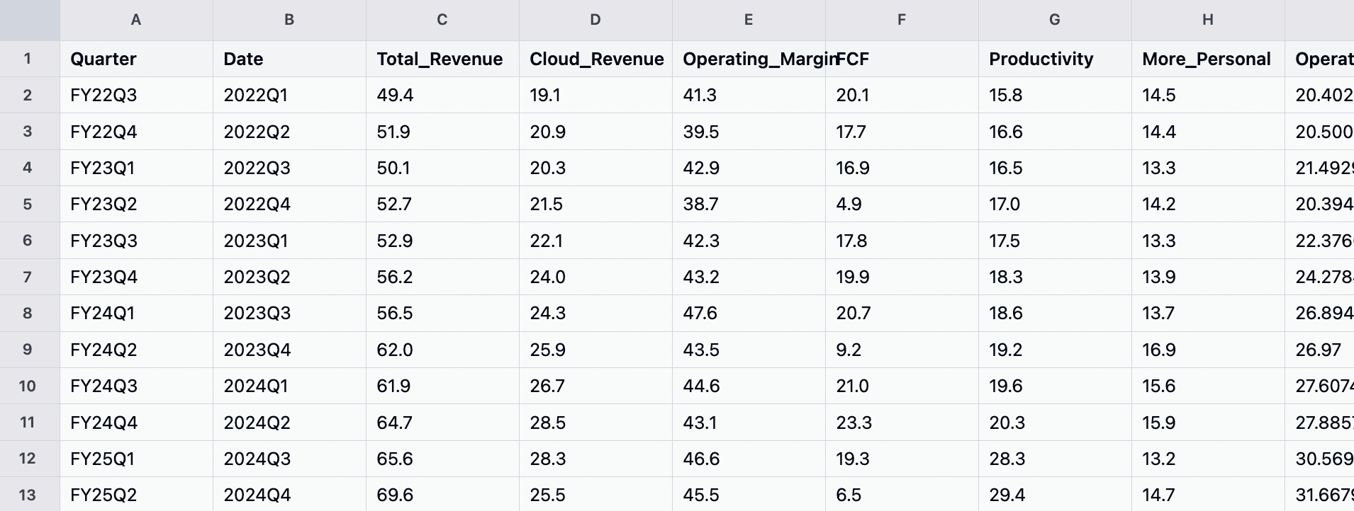 「マイクロソフト(MSFT)の過去12四半期分の収益、営業利益率、フリーキャッシュフローを取得してください。また、同期間のセグメント別収益の内訳もお願いします。」