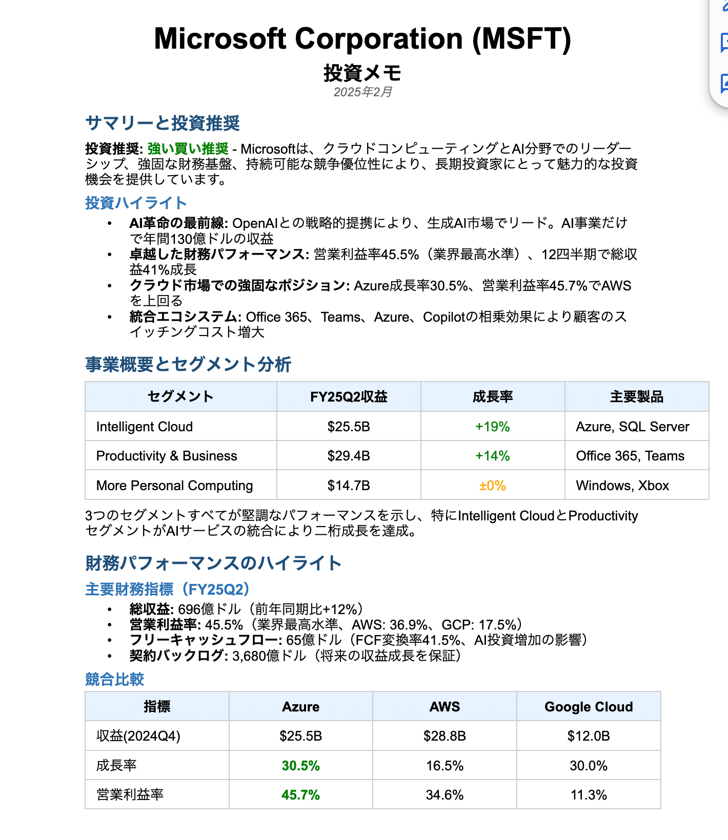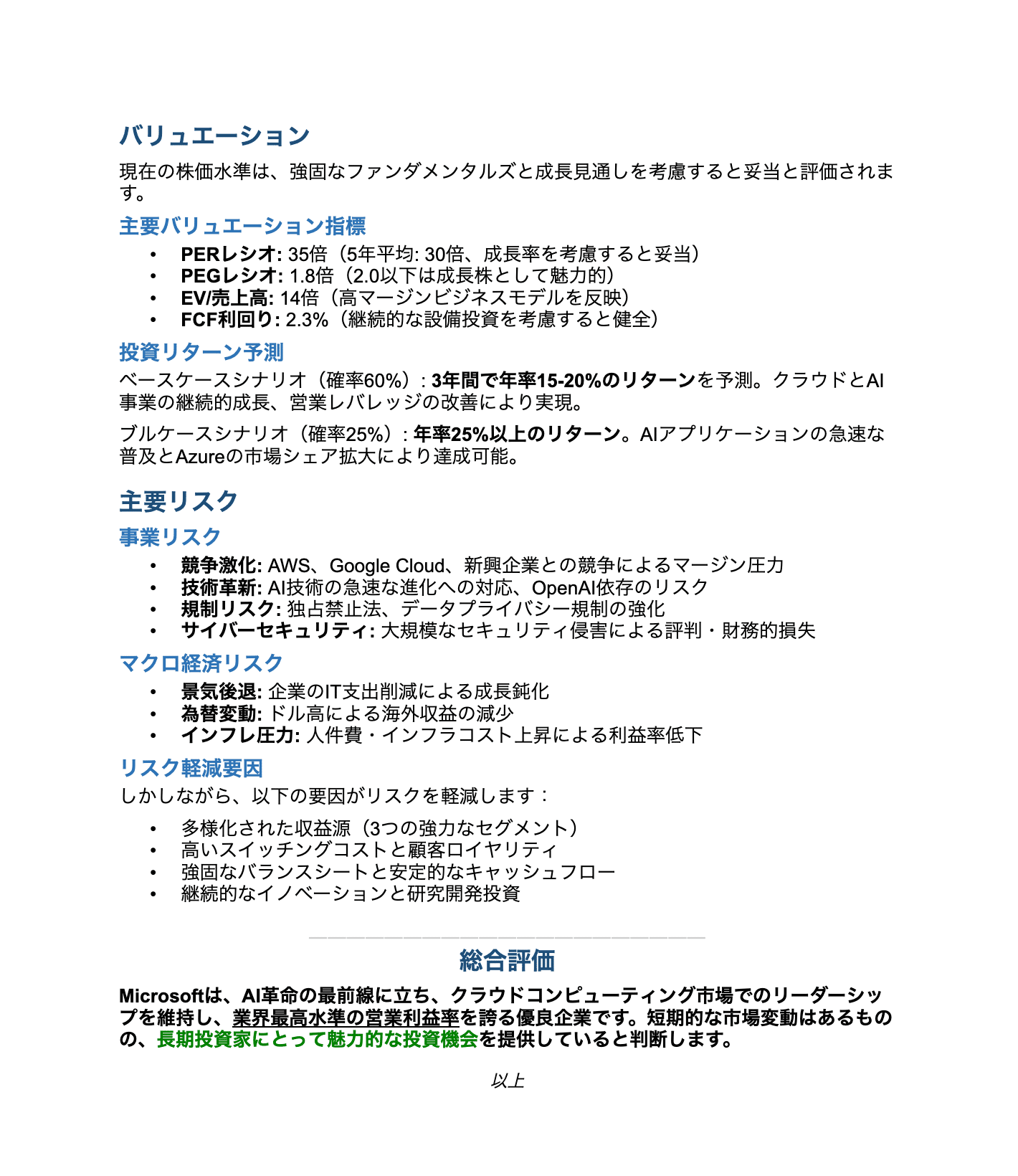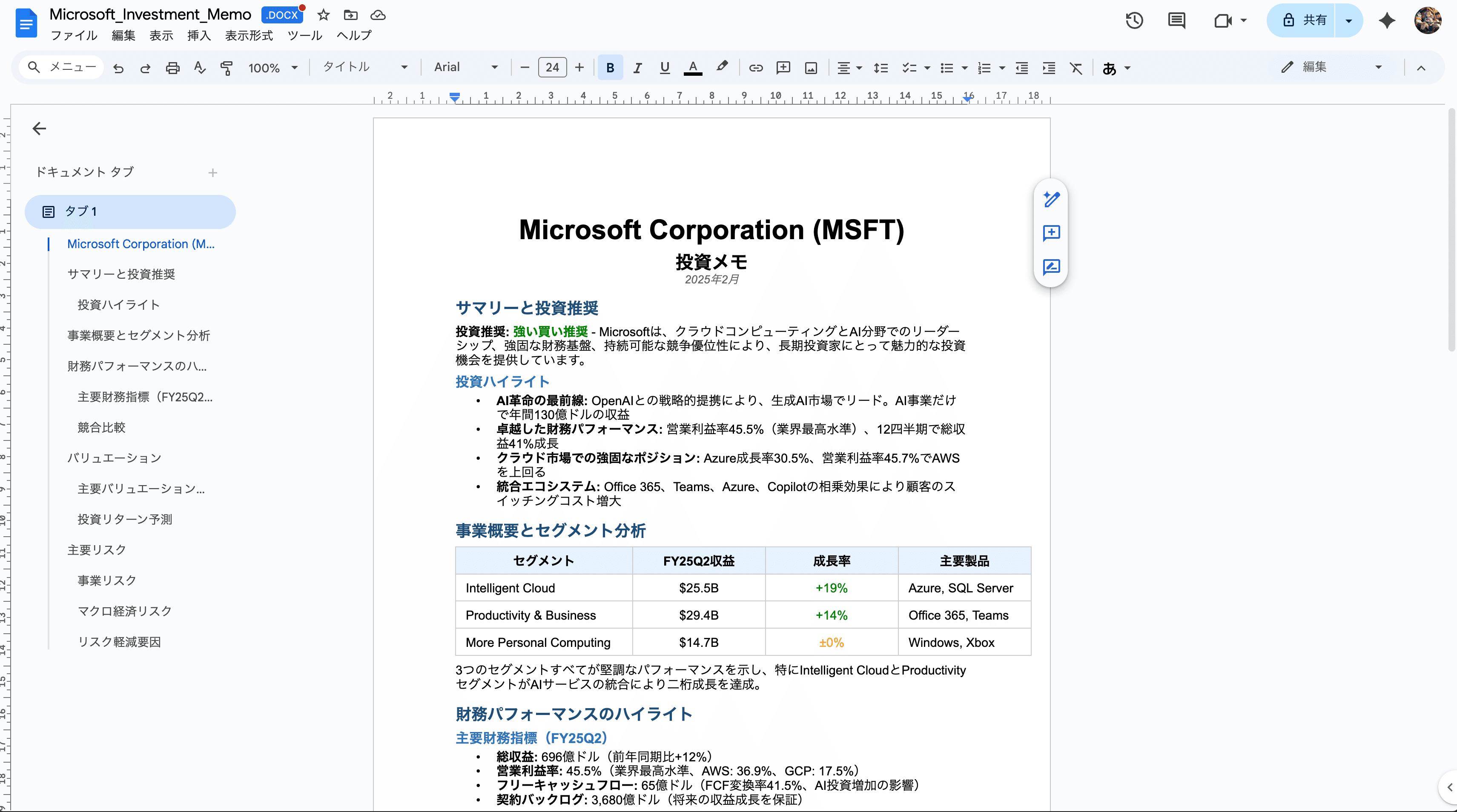 「これまでの分析をすべて統合し、マイクロソフトに関する2ページの投資メモを作成してください。構成は「サマリーと投資推奨」「事業概要とセグメント分析」「財務パフォーマンスのハイライト」「バリュエーション」「主要リスク」でお願いします。Wordドキュメント形式で出力してください。」