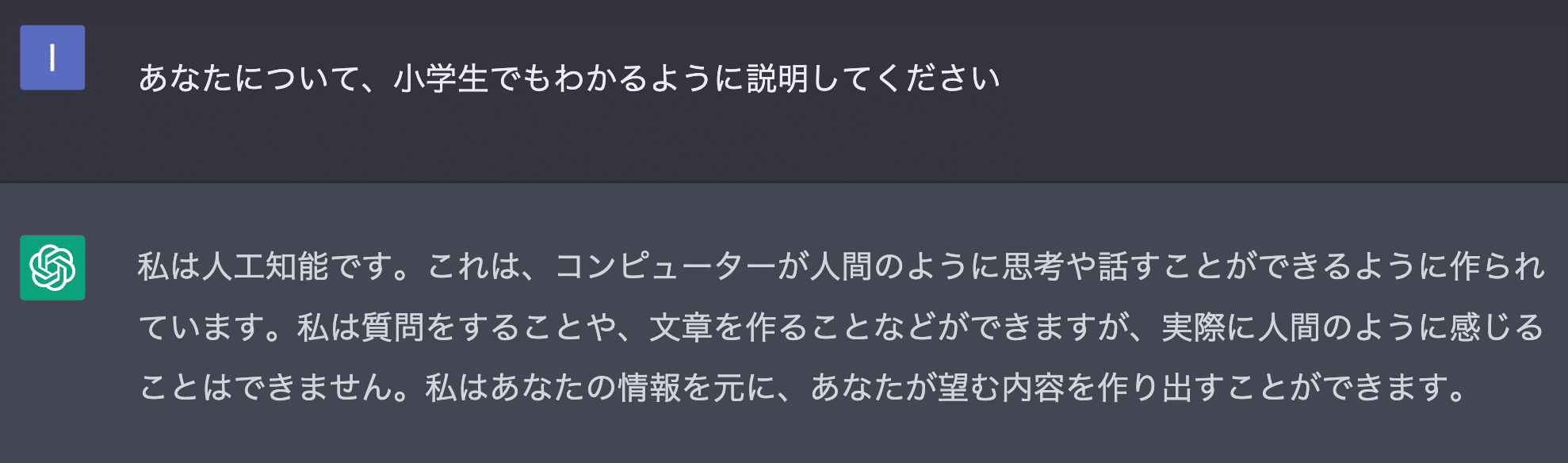 実際に ChatGPT に ChatGPT とは何なのかを説明してもらいましょう。