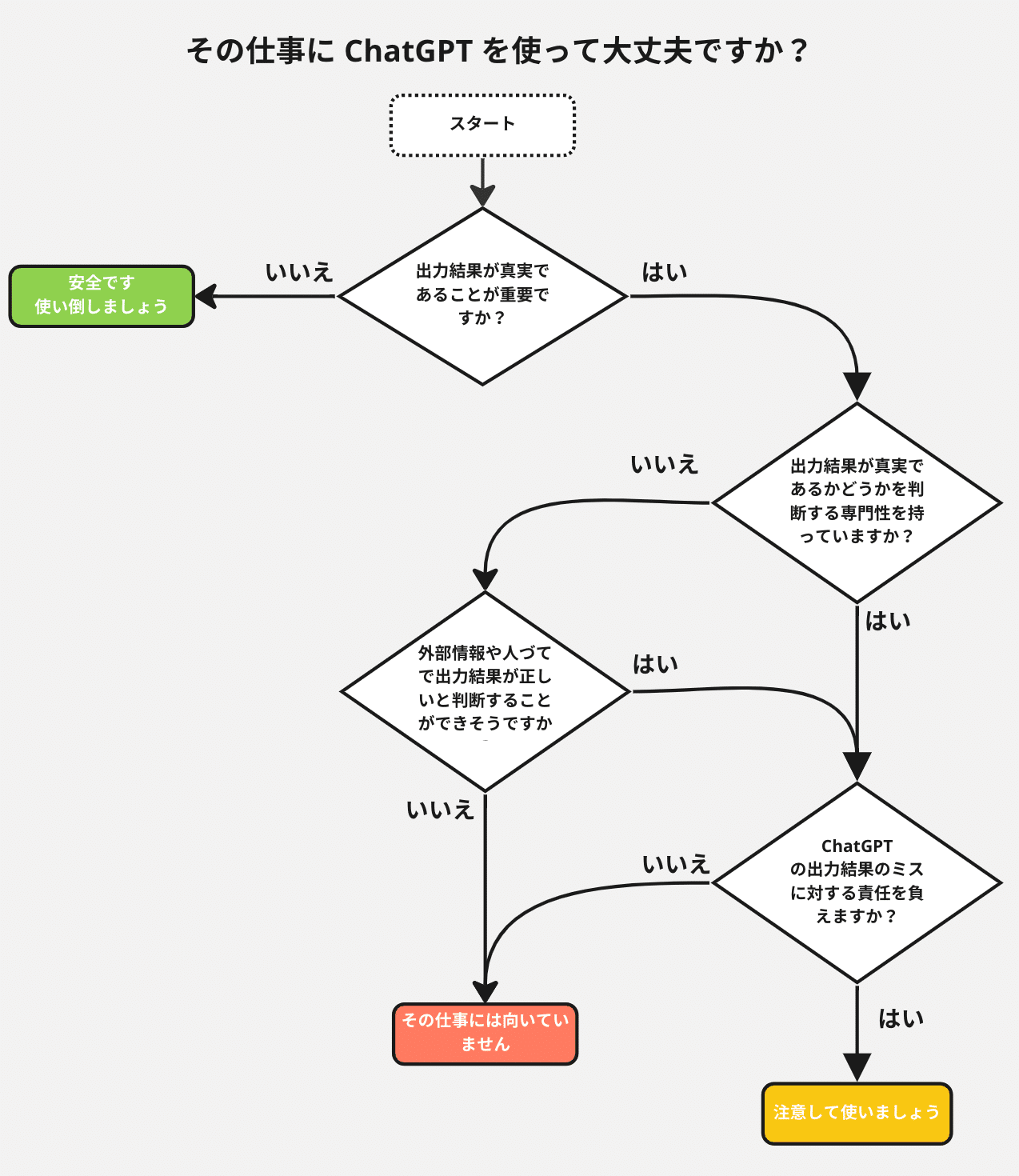 続いて、ChatGPT を使っていく上での注意点を2つだけお伝えしておきます。まず大事なことは、ChatGPT が言うことが全て正しいとは信じないことです。なぜかというと、ChatGPT は自信満々に真実ではないことをあたかも本当のことのように言うことがあるからです。この現象を、Hallucinationと言います。ChatGPT の出力結果を盲信せず、本当に大切なことは自分で判断しましょう。