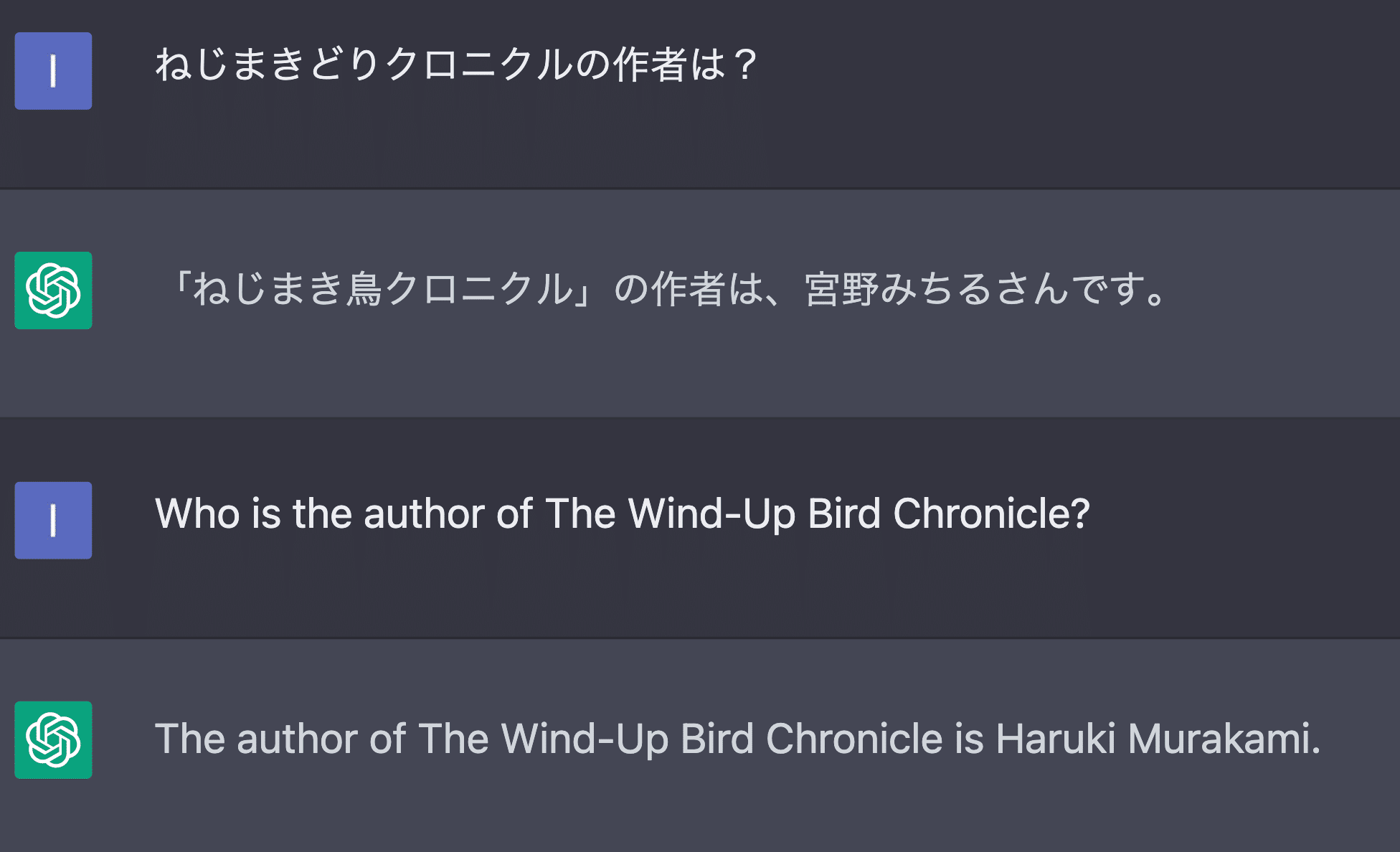 例えば、以下のように、本来は村上春樹が正解のところ、日本語で聞くと間違えます。英語は合っています。これはおそらく日本語と英語の学習するデータ量の差の問題です。