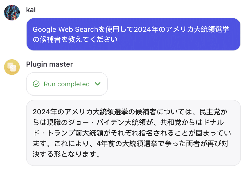 例えば、「2024年のアメリカ大統領選の立候補者を教えて」と尋ねると、最新の候補者リストと簡単な背景情報を提供してくれます。