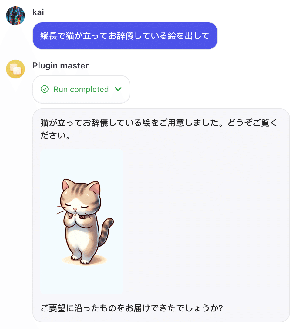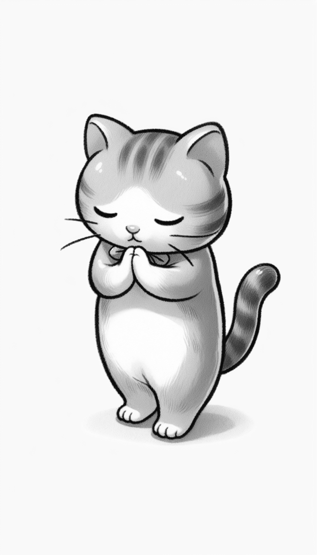 「縦長で猫が立ってお辞儀している絵を出して」という指示で、以下のような画像が出力されます。