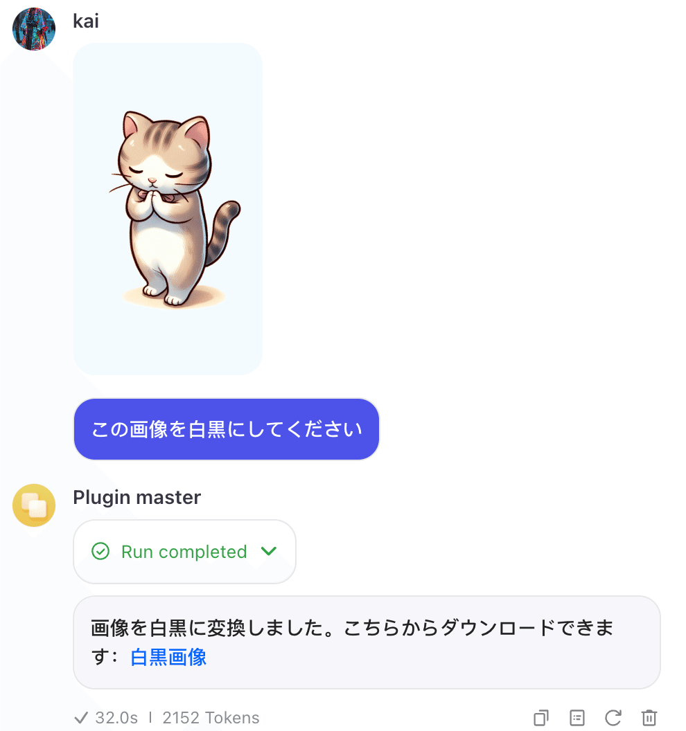 例えば、「先ほどの猫の画像を白黒にしてください」と指示すると、適切なPythonコードを生成し、画像処理を行います。