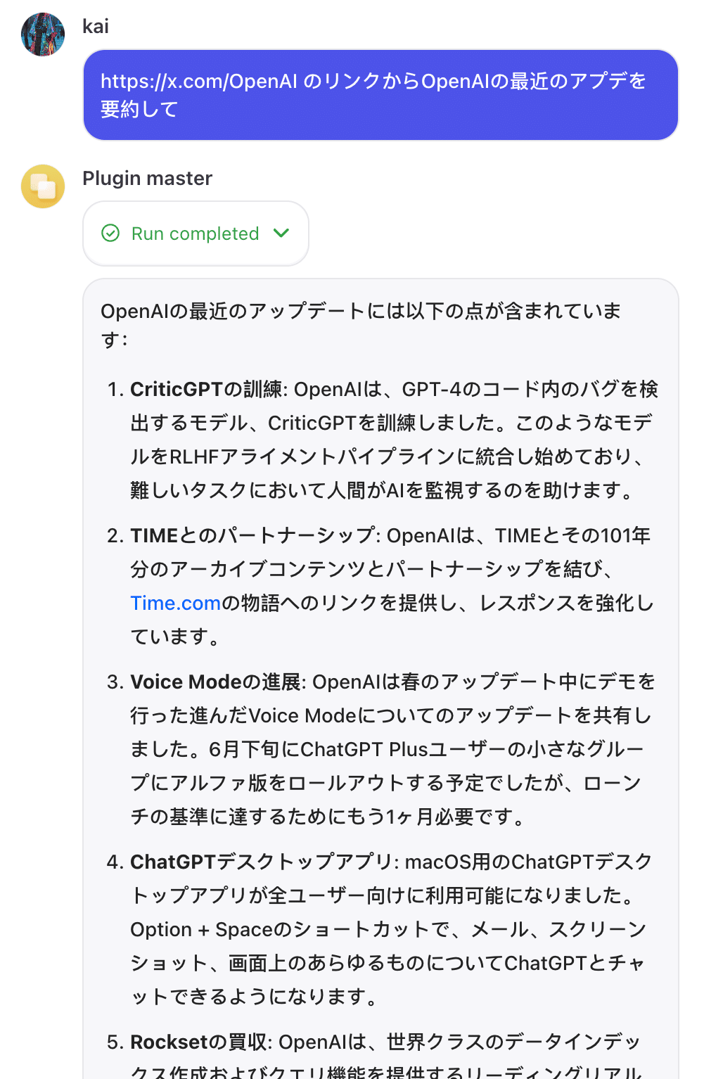 例えば、OpenAIのXアカウントのURLを入力し、「最近のアプデを要約して」と指示すれば、Xアカウントの内容を読み込み、簡潔な要約を提供してくれます。