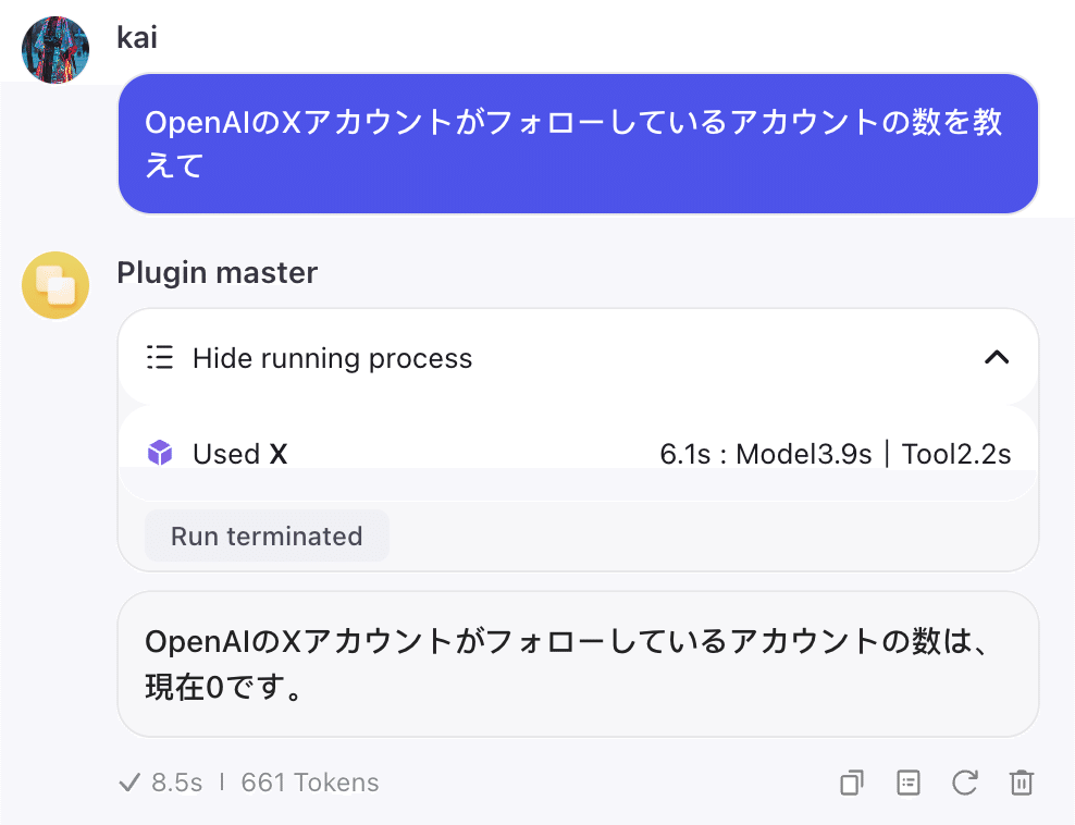例えば、「OpenAIのアカウントのフォロー数を検索して」と指示すると、最新のフォロワー数を提供してくれます。