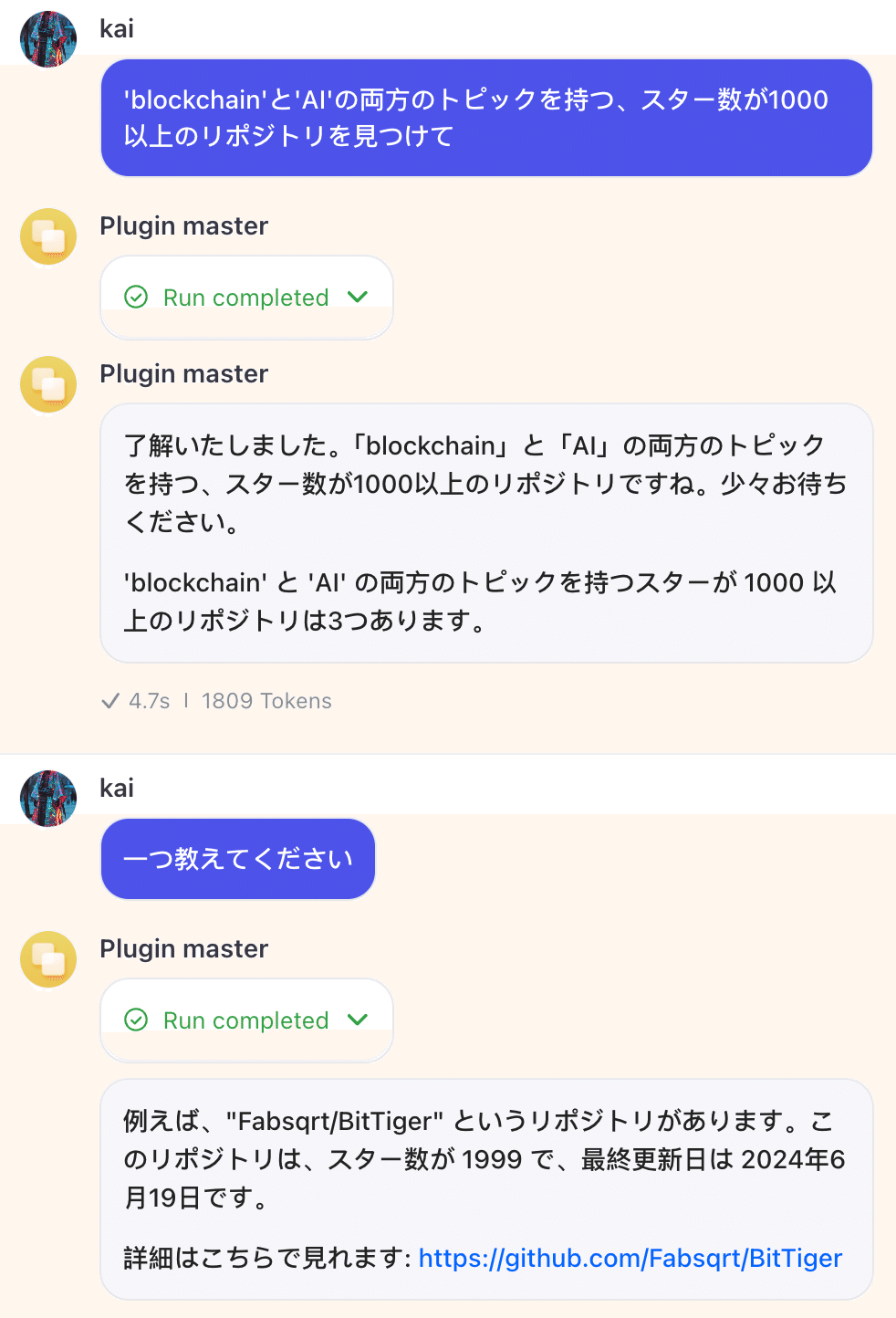 例えば、「'blockchain'と'AI'の両方のトピックを持つ、スター数が1000以上のリポジトリを見つけて」と指示すると、条件に合うリポジトリのリストを見つけ簡単な説明を作成してくれますx。