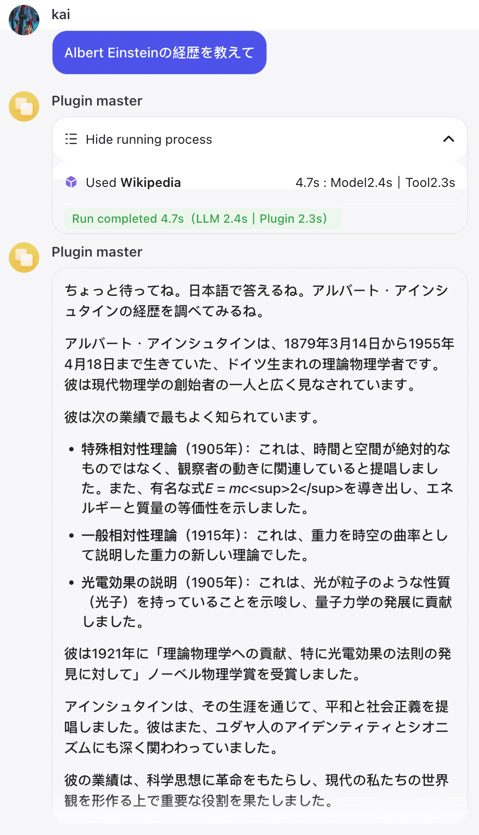 例えば、「Albert Einsteinの経歴を教えて」と尋ねると、彼の生涯、主要な業績、影響力などを簡潔にまとめた回答を提供します。