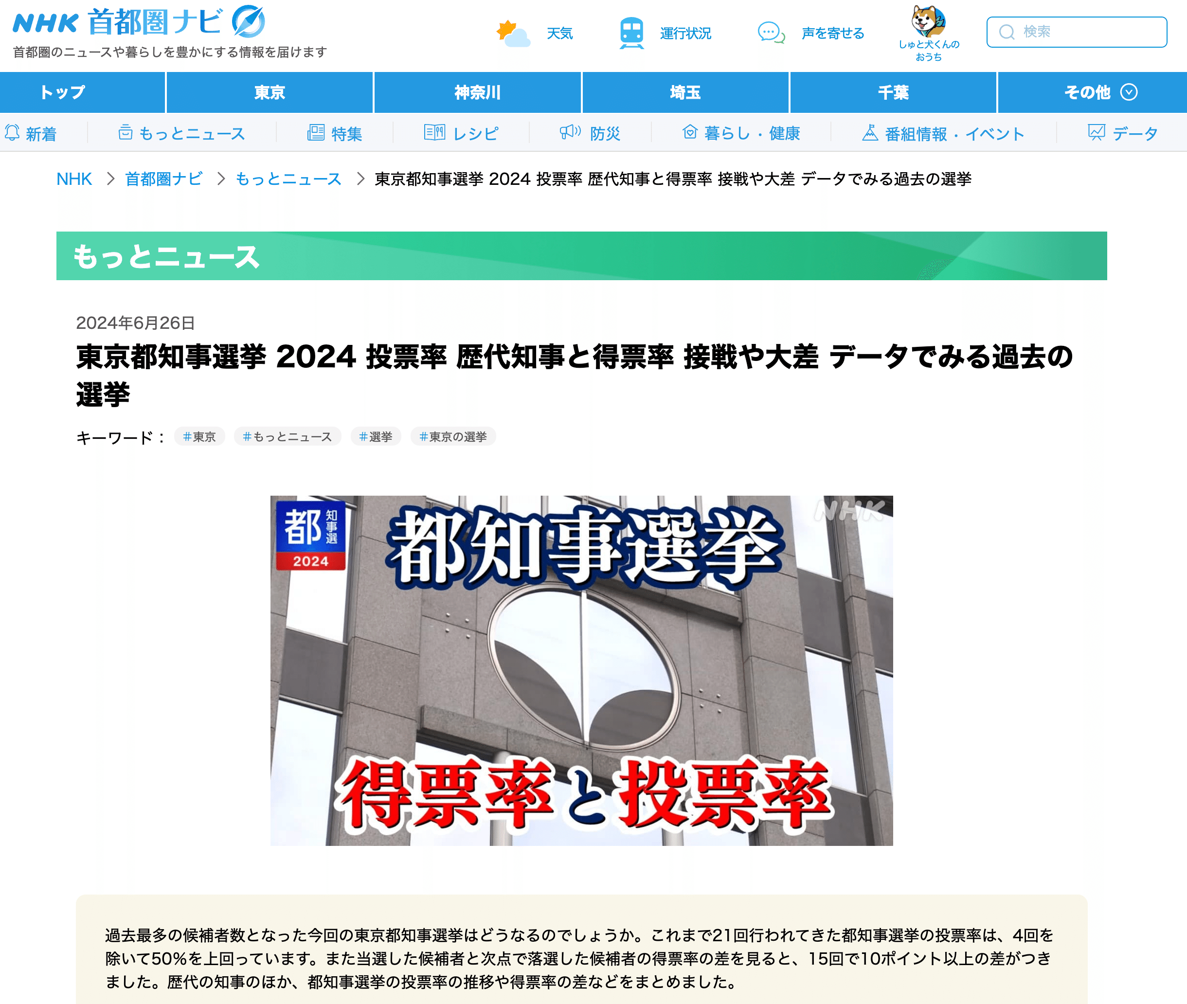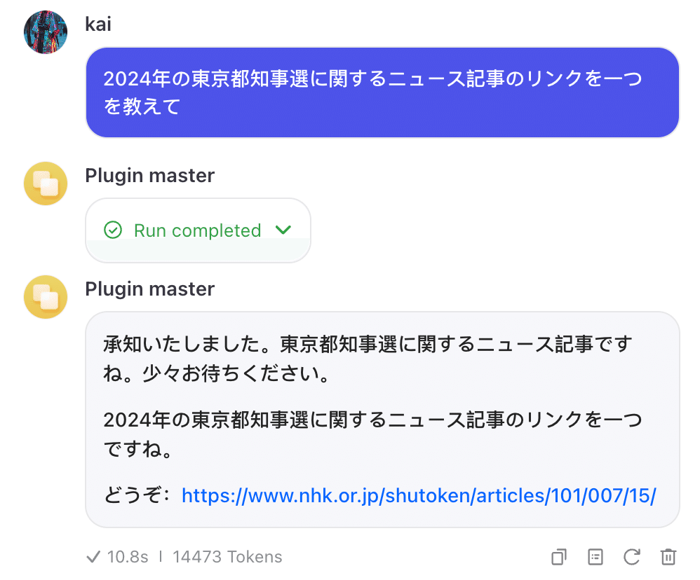 例えば、「2024年の東京都知事選に関するニュース記事のリンクを一つ教えて」と指示すると、関連する最新のニュース記事のリンクを見つけてくれます。