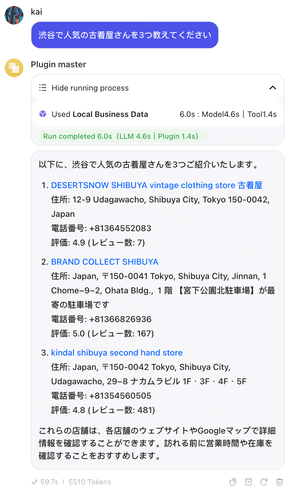 例えば、「渋谷で人気の古着屋さんを3つ教えてください」と指示すると、評価の高い店舗のリストと各店舗の簡単な説明、営業時間などの情報を提供します。