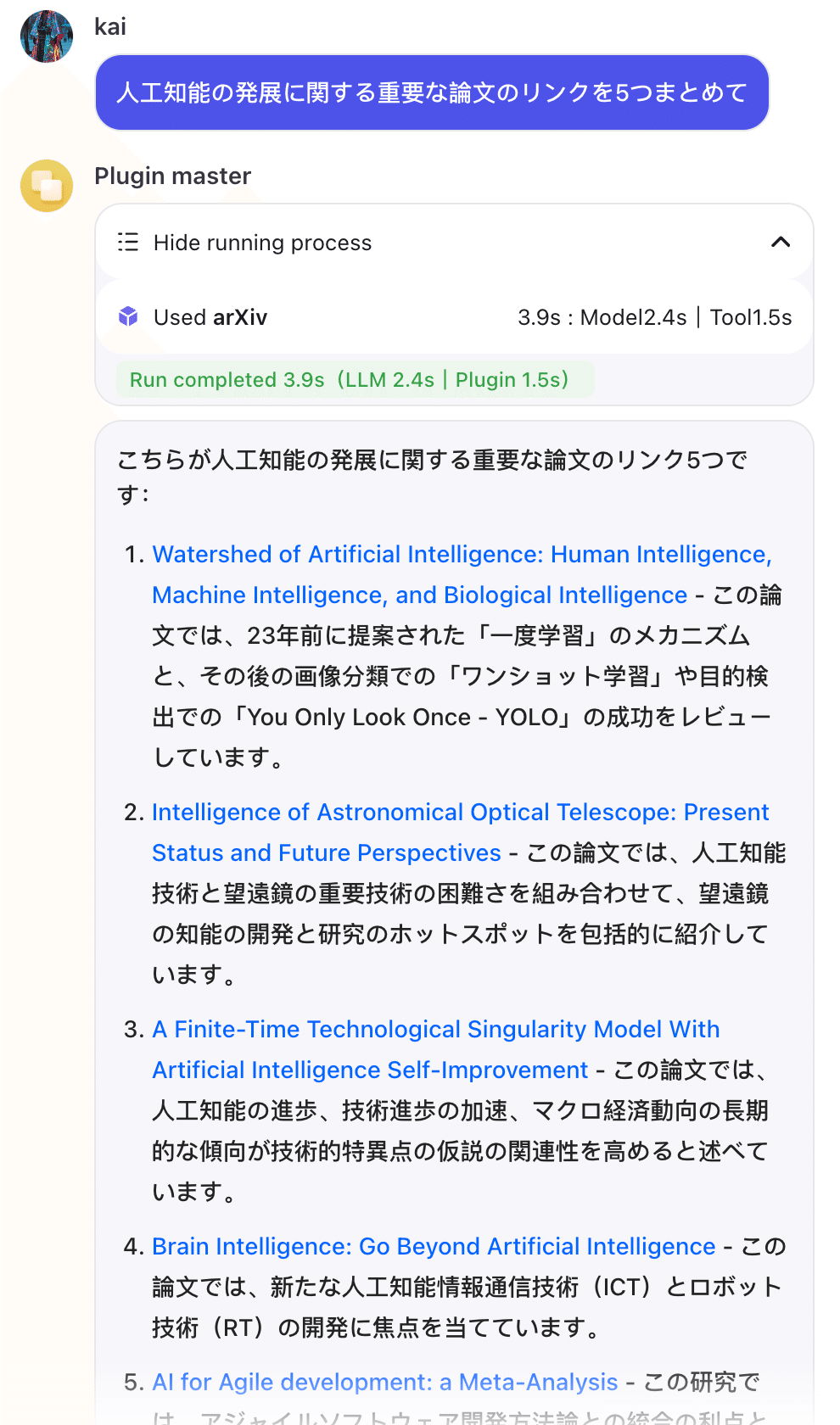 例えば、「人工知能の発展に関する重要な論文のリンクを5つまとめて」と指示すると、関連性の高い論文のリストと各論文の簡単な要約、リンクを提供してくれます。