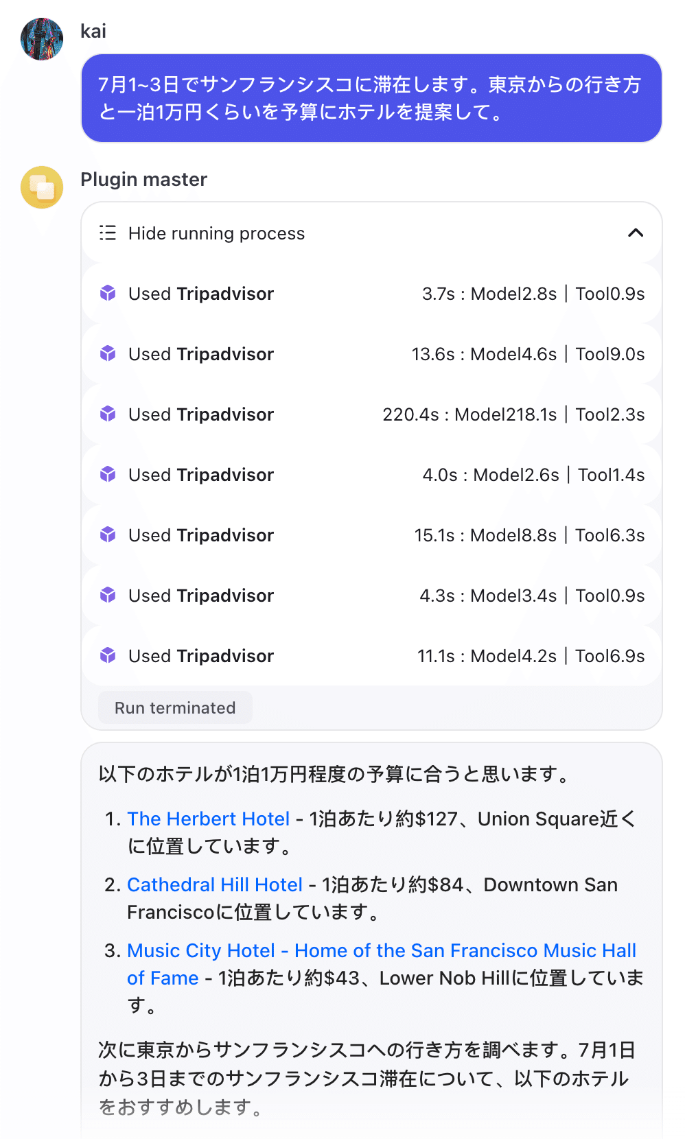 例えば、「7月1~3日でサンフランシスコに滞在します。東京からの行き方と一泊1万円くらいを予算にホテルを提案して」と指示すると、フライトオプション、予算内のホテル候補、簡単な旅程案を提供します。