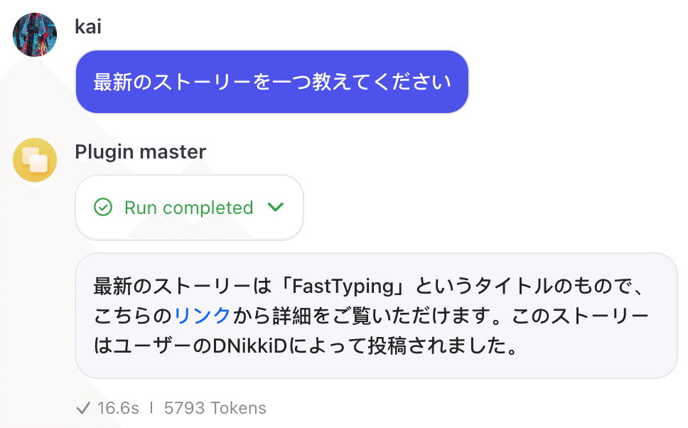 例えば、「最新のストーリーを一つ教えてください」と指示すると、Hacker Newsの最新記事のタイトル、リンク、投稿者などの情報を検索してくれます。
