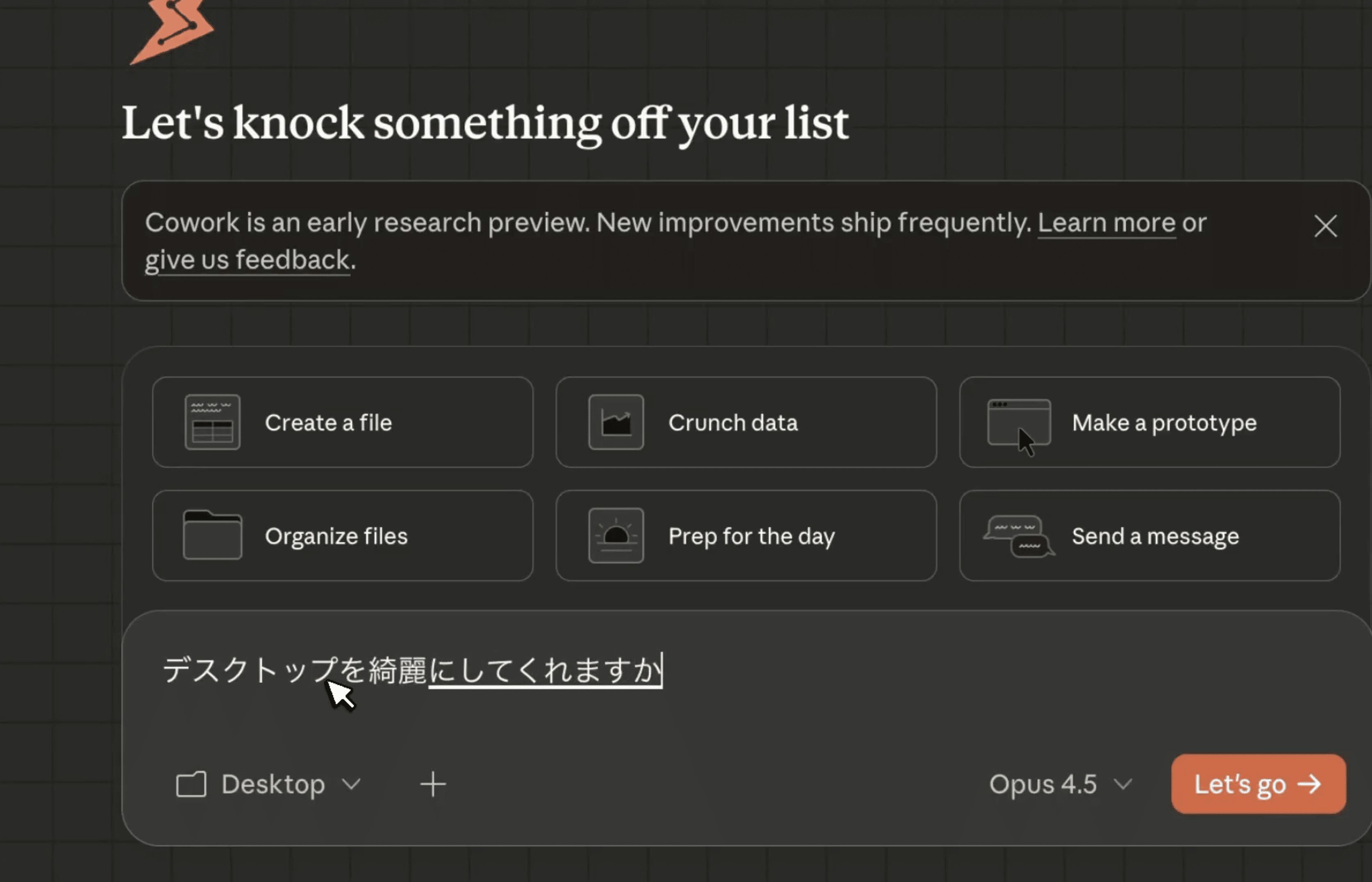 ③ チャット欄にタスクを入力(例:「デスクトップを整理して」)
