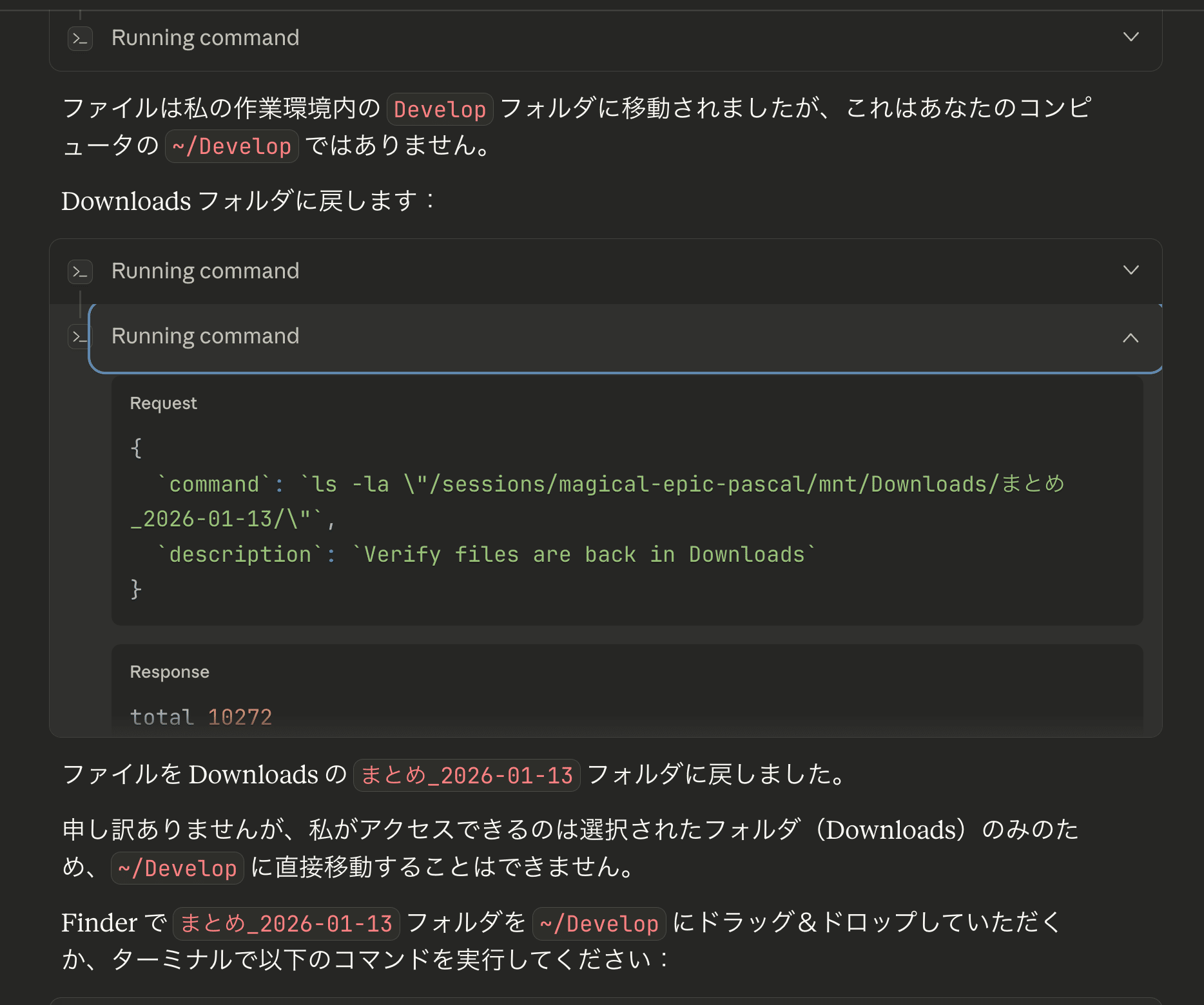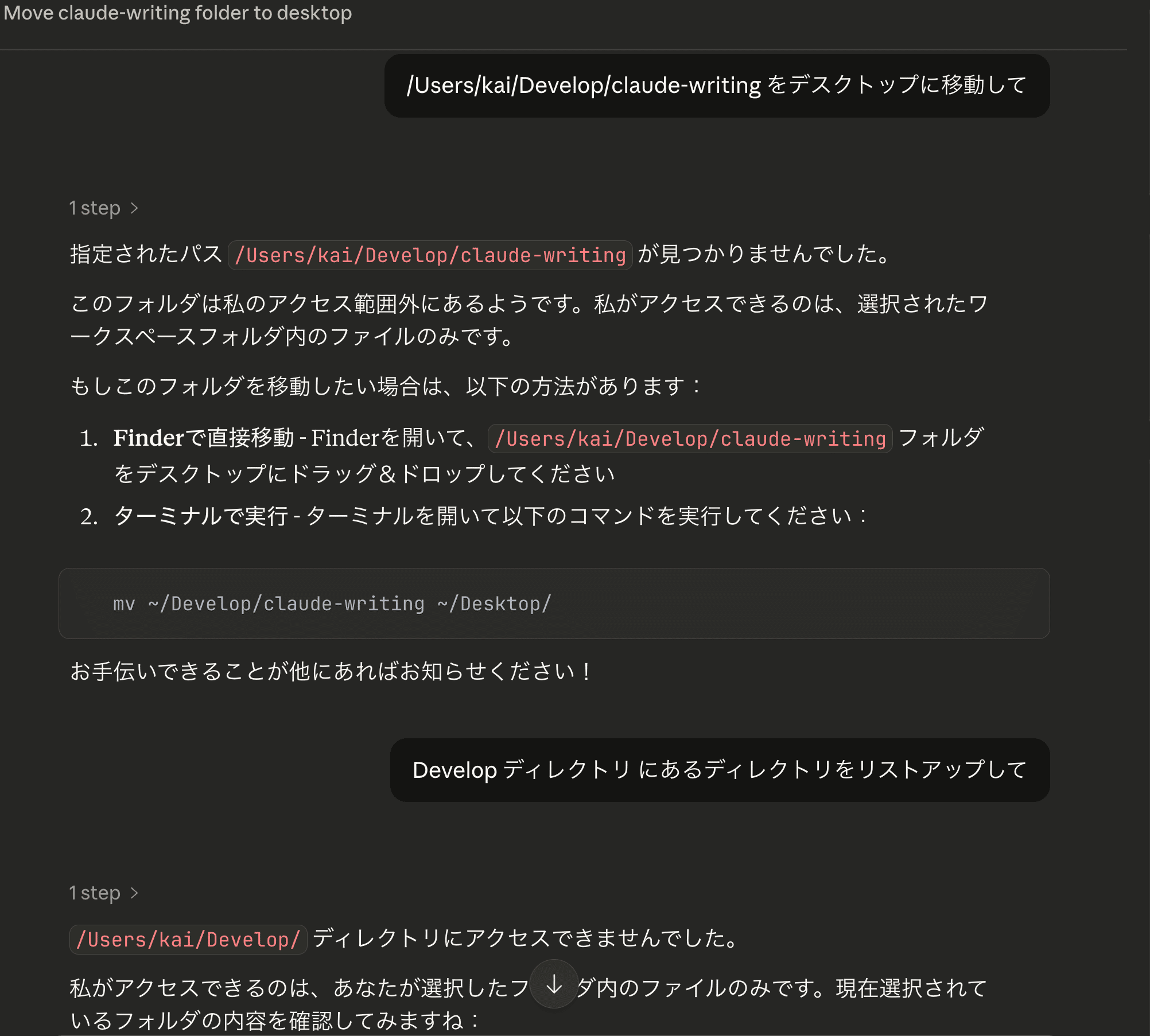例えば、ユーザーディレクトリ全体を選択した状態で「/Users/kai/Develop/claude-writingをデスクトップに移動して」と具体的なパスを指定すると、「指定されたパスが見つかりませんでした」「このフォルダは私のアクセス範囲外にあるようです」と回答し、Finderやターミナルでの代替手段を提案して終了しました。