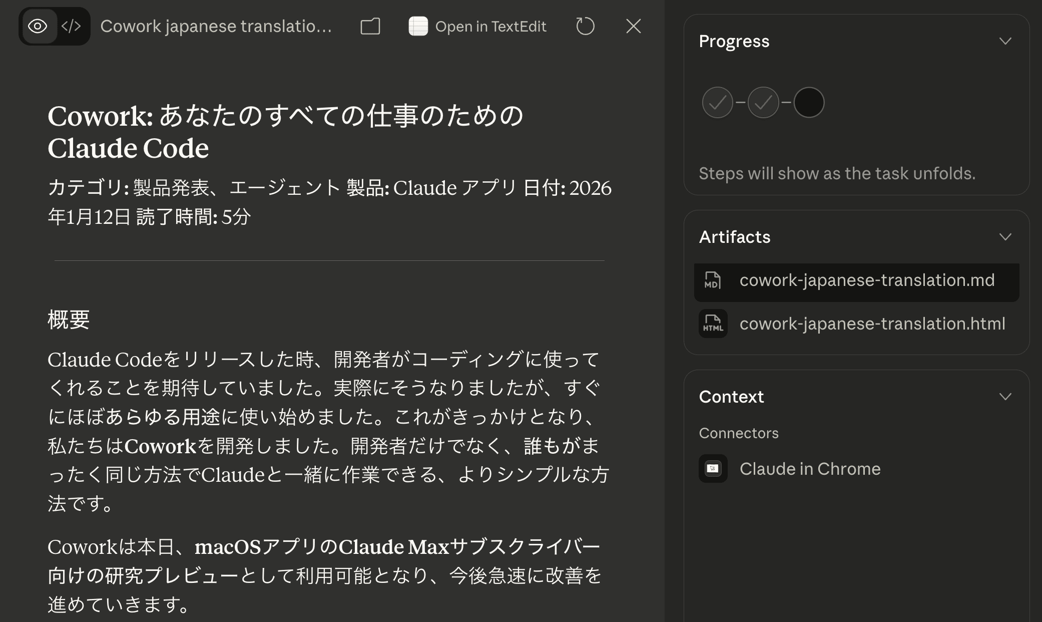 Coworkは自動でChromeを起動し、ページにアクセス。テキストを取得して翻訳を行いました。最初の出力はMarkdown形式のシンプルな翻訳文でした。こういった出力をArtifactsで即座に確認できる点も非常に便利です。