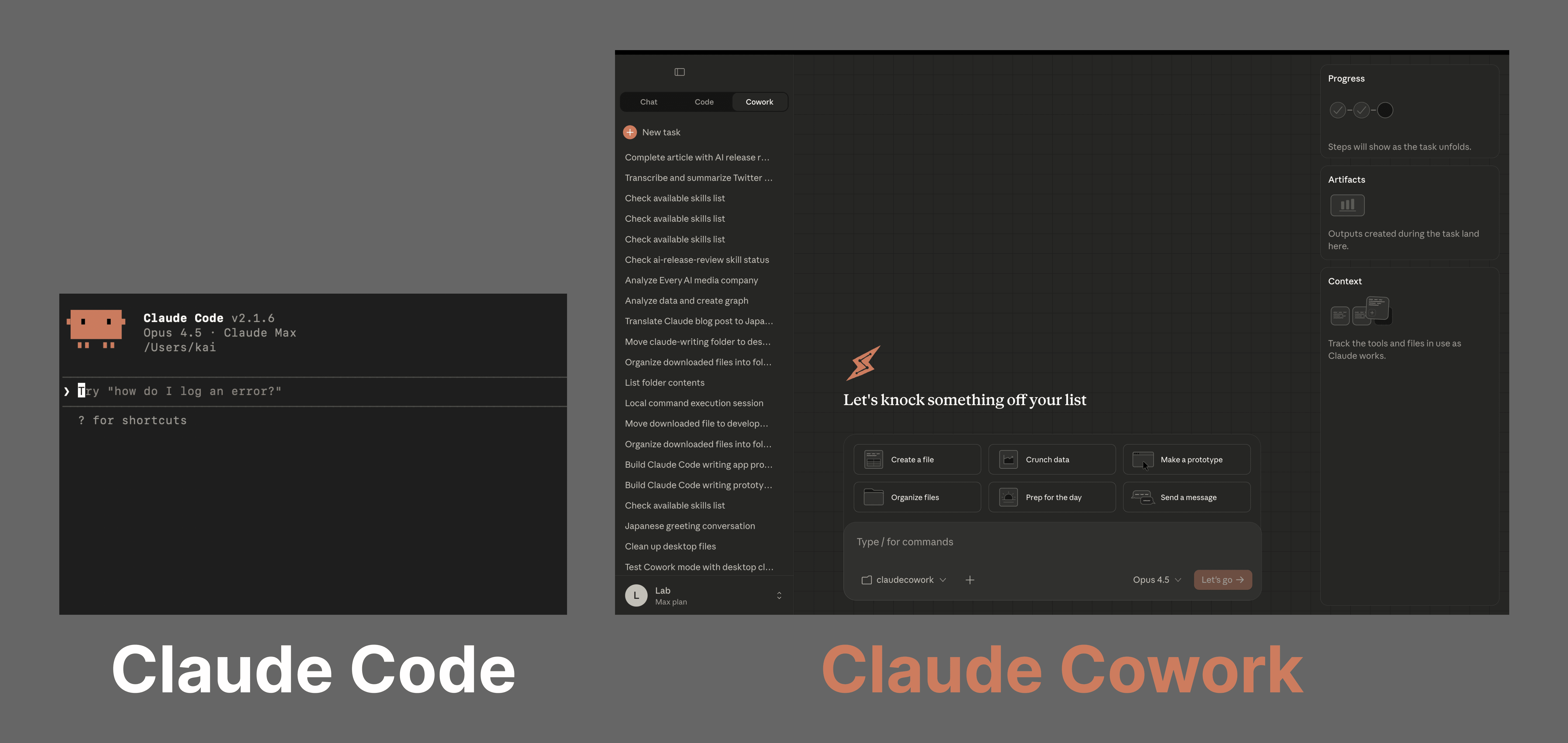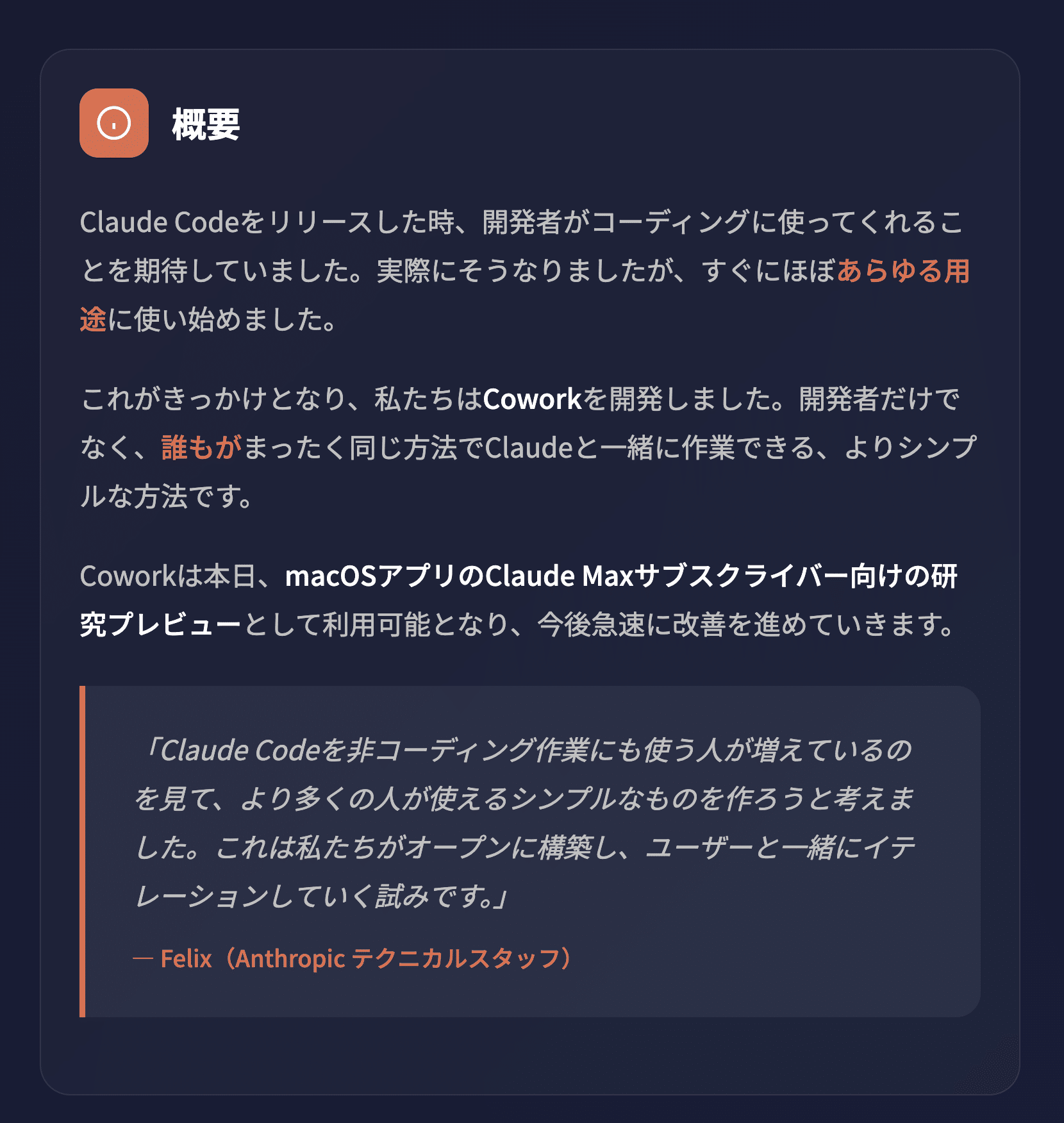 Coworkは、Claude Codeのエージェント機能を非開発者にも開放した機能です。技術的には同じ基盤を使いながら、ターミナル操作を隠し、GUIで完結するようにしています。