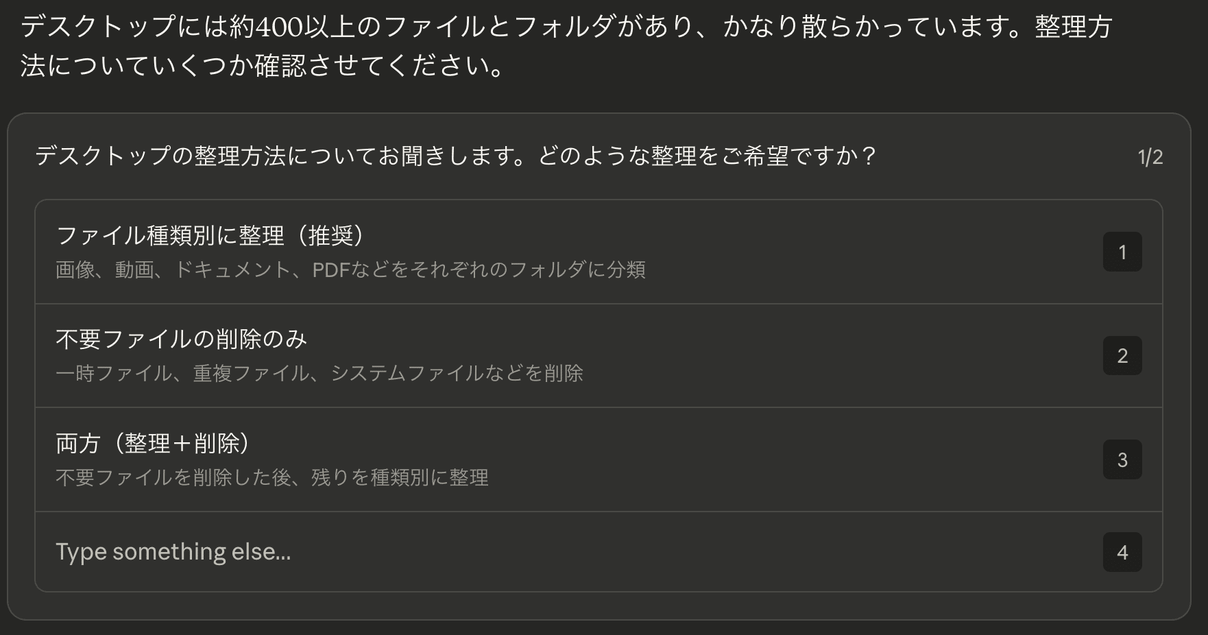 たった1行の指示ですが、Coworkはまずデスクトップの状態を確認し、質問を投げかけてきました。