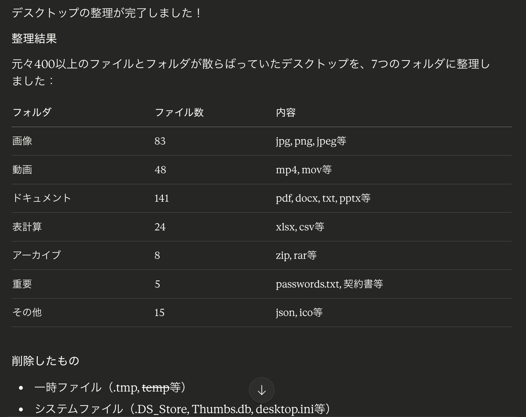一時ファイルやシステムファイル、空フォルダ約70個も自動で削除されました。「passwords.txt」「契約書_最終版.pdf」などは「重要」フォルダに移動するという判断も見られます。