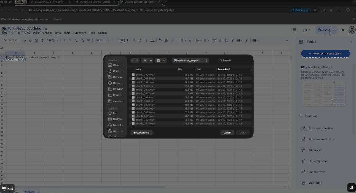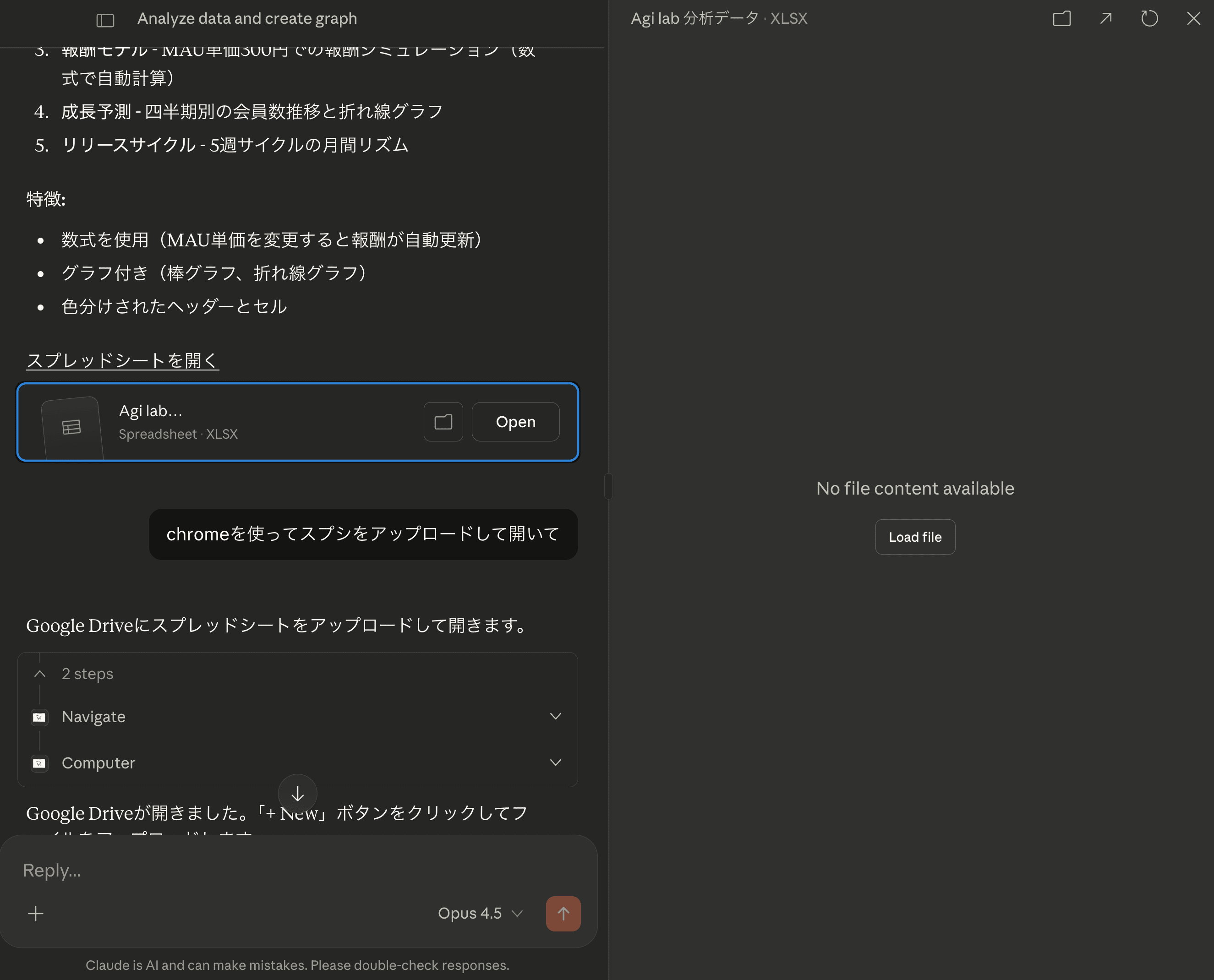 「Chromeを使ってスプシをアップロードして開いて」と指示したところ、CoworkはGoogle Driveを開き、「New > File upload」をクリックするところまでは進みましたが、OSのファイル選択ダイアログが開いた時点で操作が止まりました。