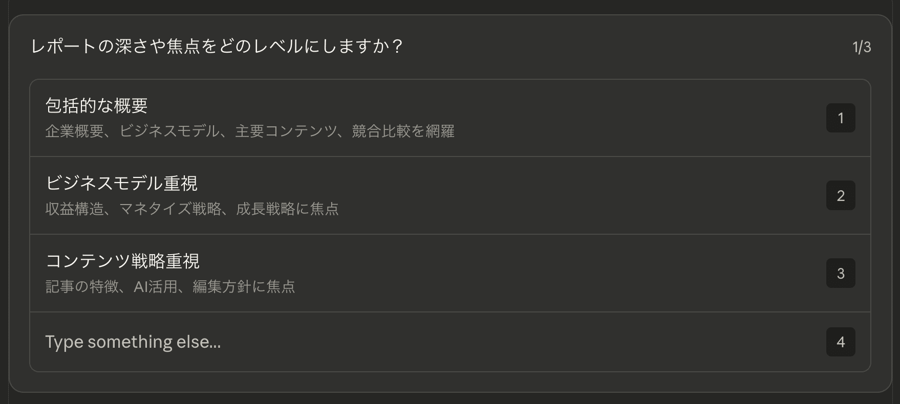 ここでもCoworkは最初に質問を投げかけてきました。「包括的な概要」「ビジネスモデル重視」「コンテンツ戦略重視」という3つの選択肢がボタンで表示されます。