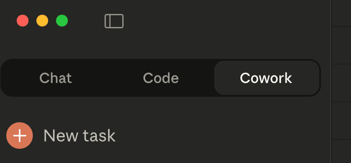 Claude Desktopを開くと、画面上部に「Chat」「Code」「Cowork」の3つのタブが表示されます。「Cowork」タブをクリックするとモードが切り替わります。