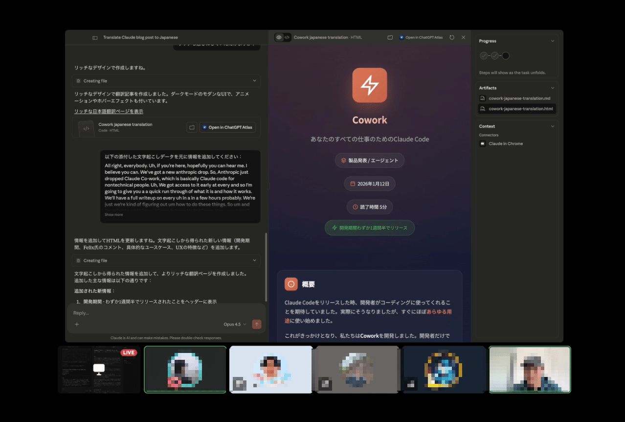 次に試したのは、Claude in Chrome拡張機能との連携です。Coworkの公式ブログを日本語に翻訳し、リッチなHTMLページを作成するタスクを実行しました。