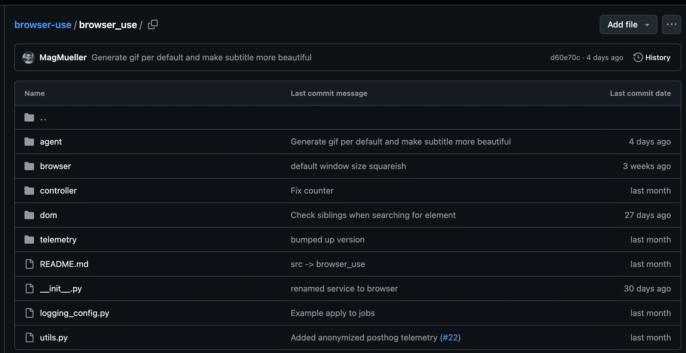 browser-use のコードは、主に下記のフォルダで構成されています。各フォルダが役割分担しており、全体としてブラウザ操作を管理します。