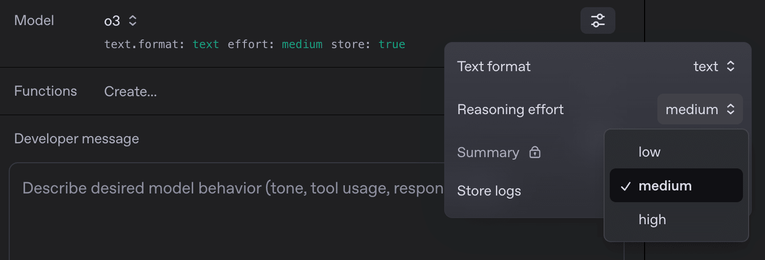 開発者は、APIリクエスト時に reasoning.effort パラメータ(low, medium, high)を指定することで、思考の深さ(≒Reasoning Tokensの消費量と応答精度・速度のトレードオフ)をある程度制御できるようです。