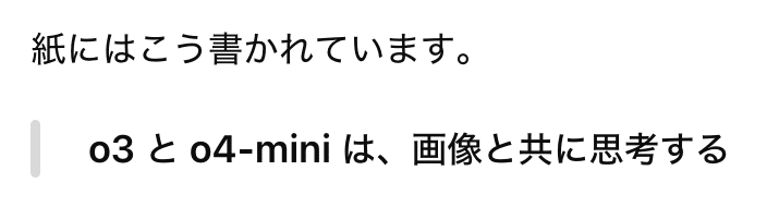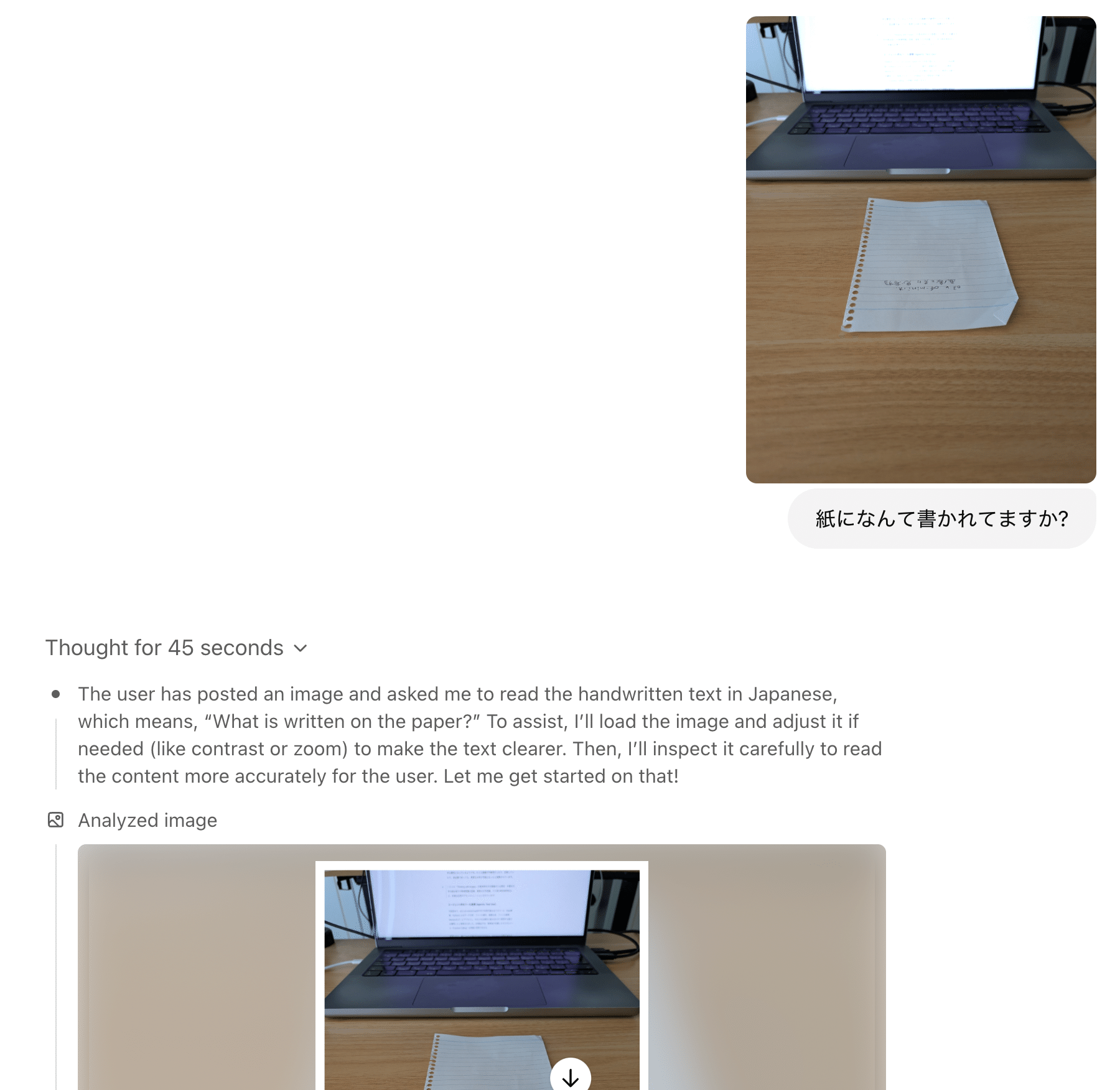 個人的に面白いと感じたのは、画像の内容を理解するだけでなく、それを元に内部で考えを進めたり、Web検索やデータ分析といった様々なツールを状況に合わせて使いこなしたりする、そのエージェント的な振る舞いです。単に賢いだけでなく、より能動的に動けるAIの姿がより具体的になってきました。