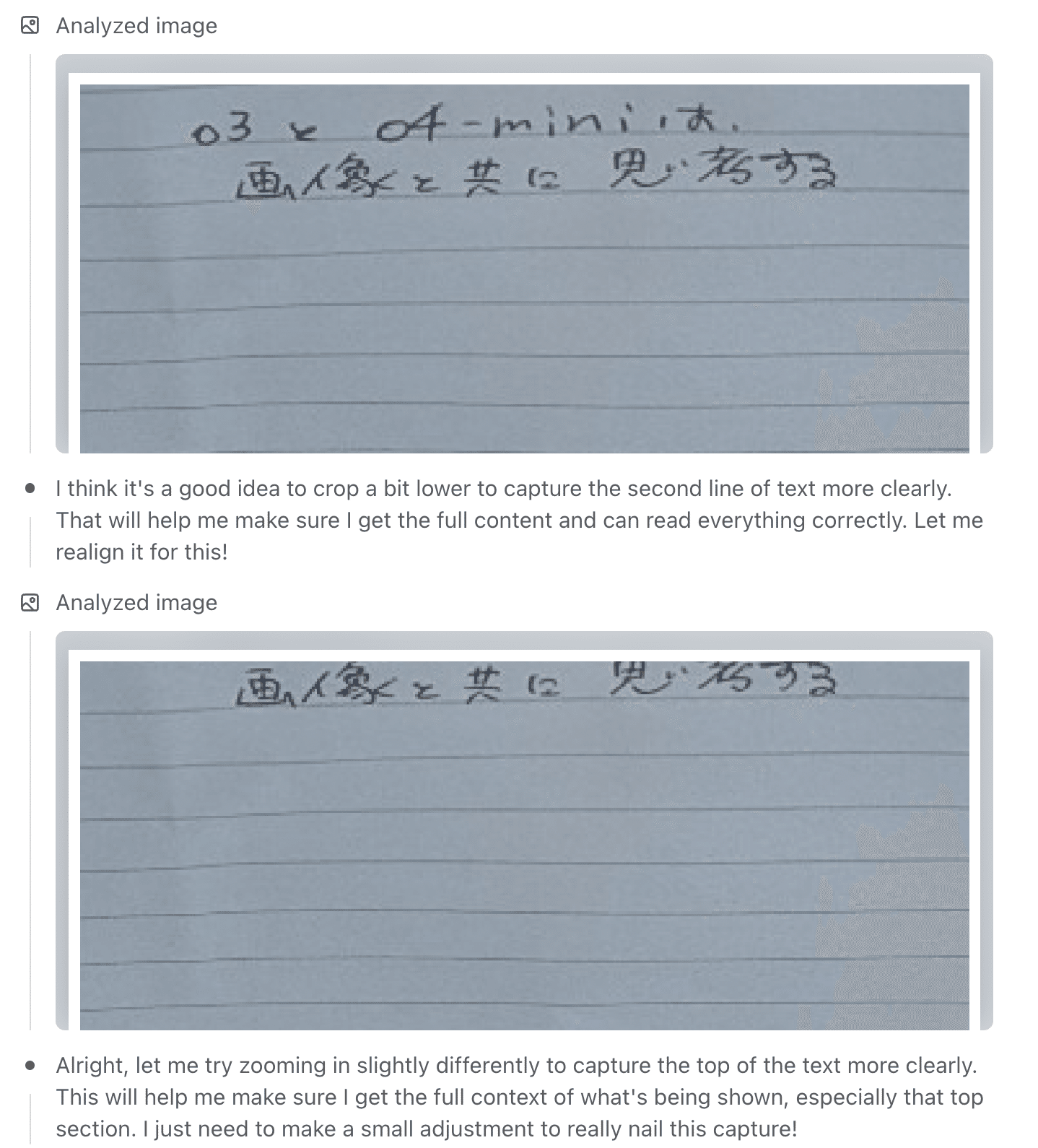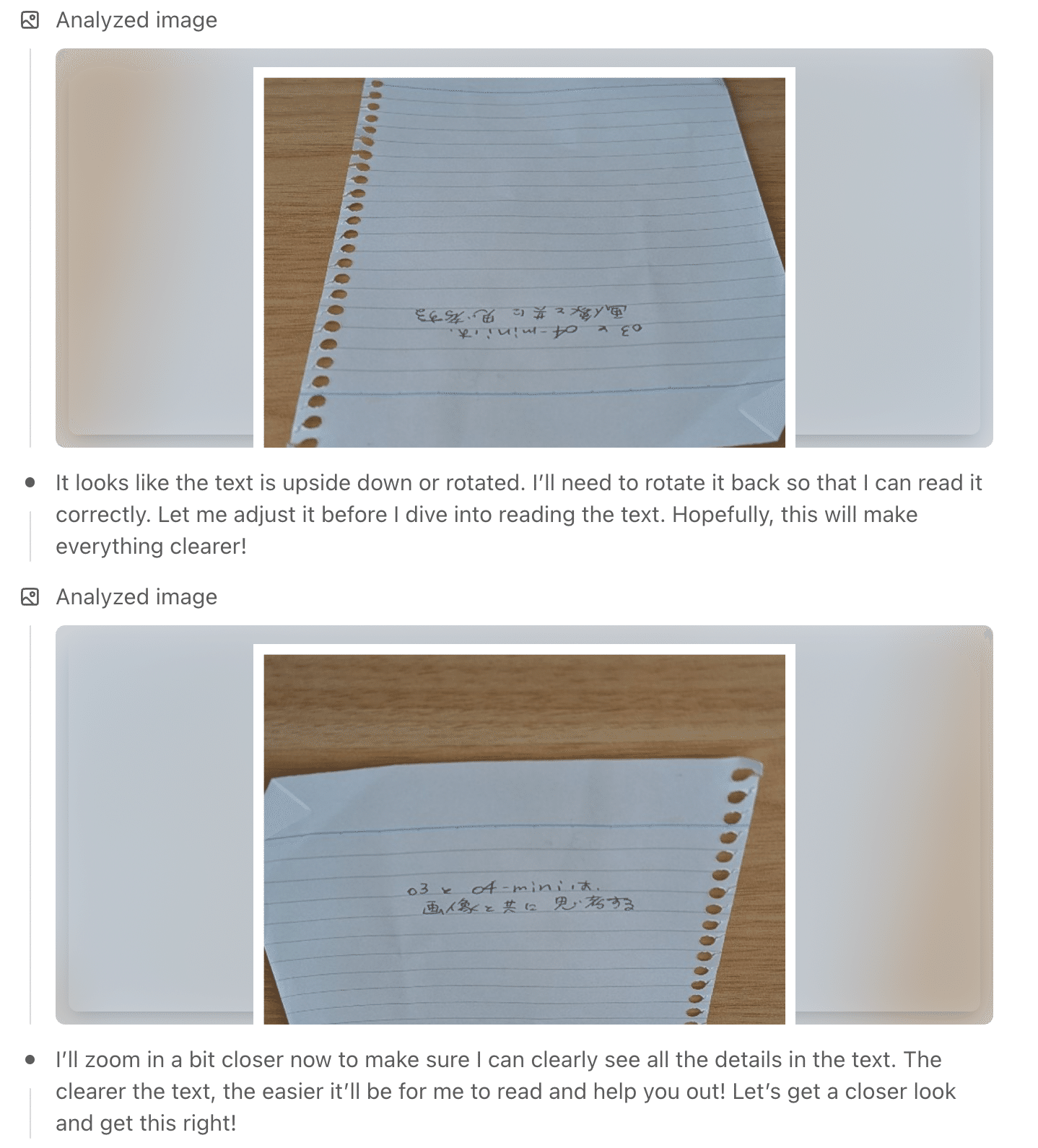 o3とo4-miniは、単に画像を「見る」だけでなく、その画像を思考プロセスに直接統合する能力を獲得しました。ユーザーがアップロードしたホワイトボードの写真、教科書の図、手書きのスケッチなどを解釈するだけでなく、さらに内部的にツールを使って画像を操作(回転、ズーム、切り抜き、変換など)しながら推論を進めることが可能になったとしています。