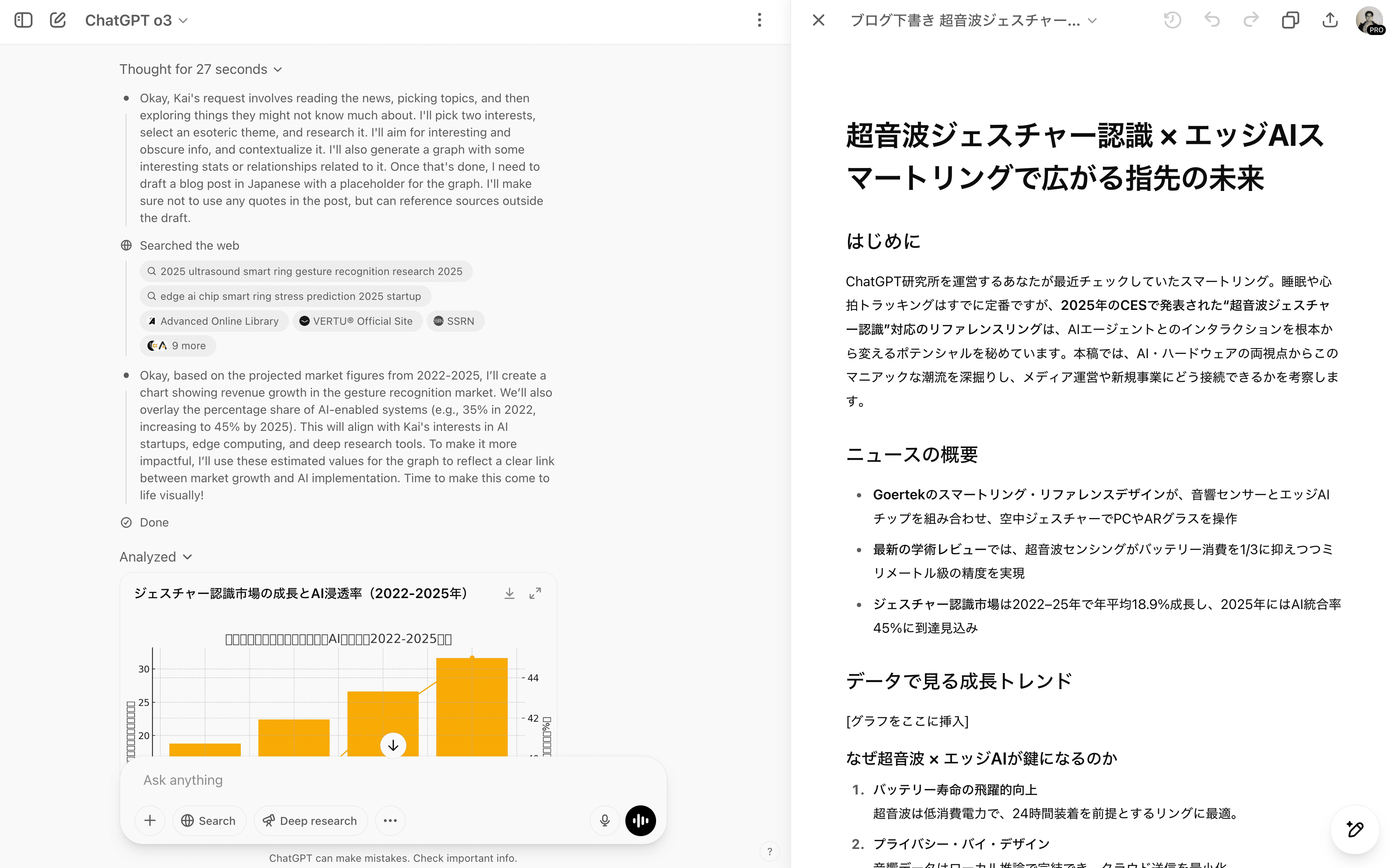挙動を見ていると、途中で情報が不足していると判断すれば、再度Web検索を行うなど、柔軟な対応も可能そうです。これは、AIがより自律的なエージェントとして機能するための重要な一歩と言えそうです。