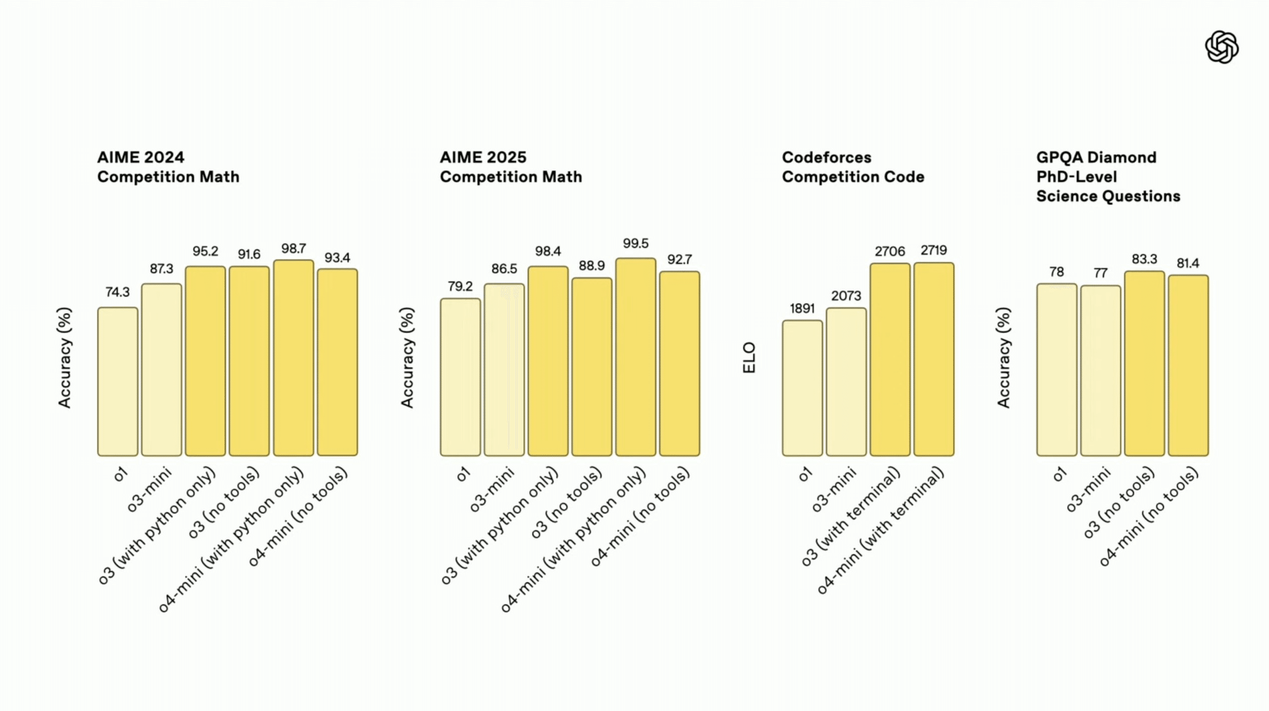 公開されているベンチマークの数字を見る限り、今回登場した OpenAI o3 と o4-mini の能力は驚異的です。