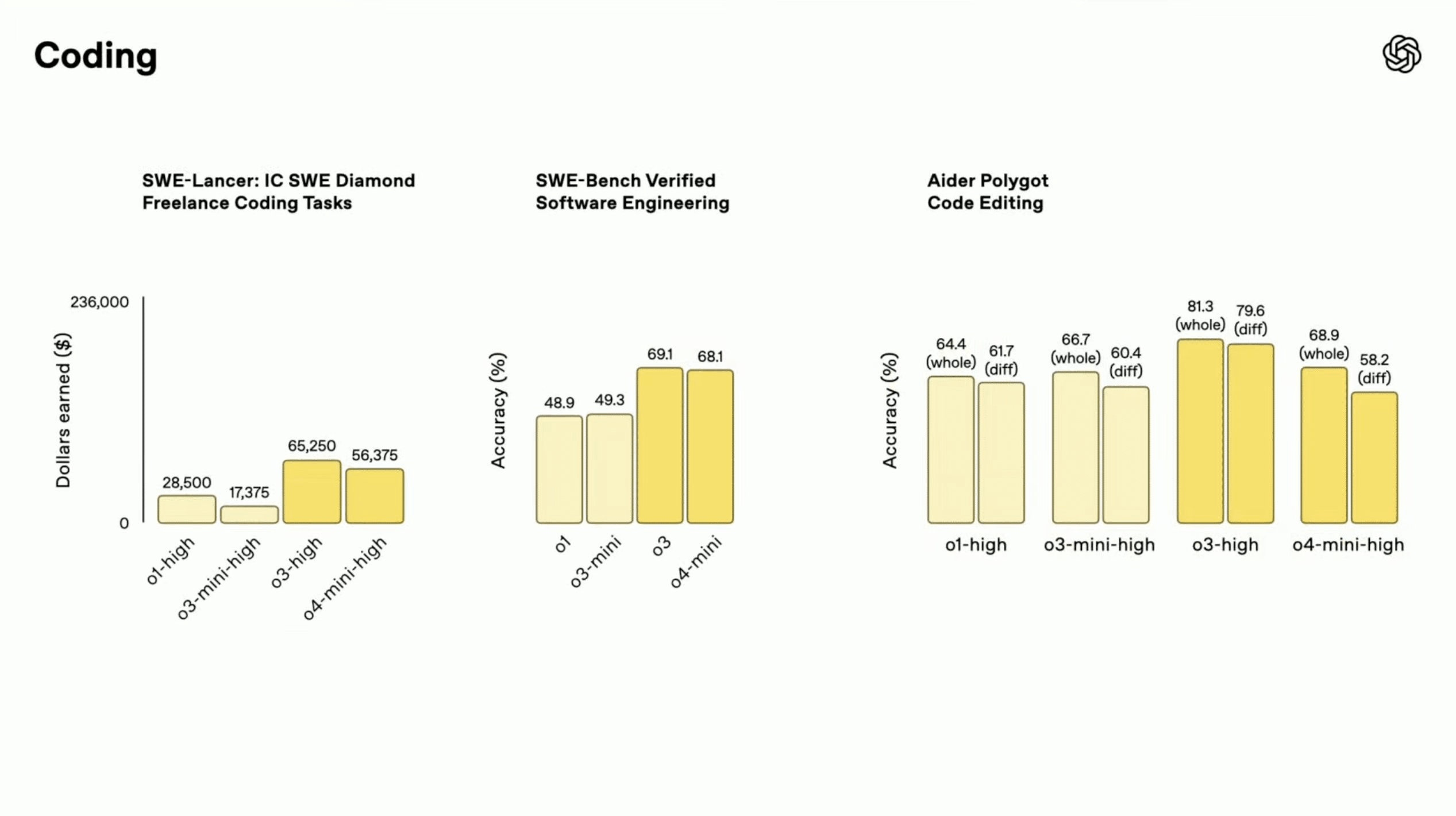 ソフトウェア開発課題(SWE-Bench Verified)やフリーランスのコーディングタスクシミュレーション(SWE-Lancer)、コード編集タスク(Aider Polyglot)など、コーディング関連のベンチマークでも高い性能を示しています。特にo3は、複雑なソフトウェアエンジニアリングタスクにおいて、既存のSOTAに匹敵するか、それを上回る結果を出しているようです。
