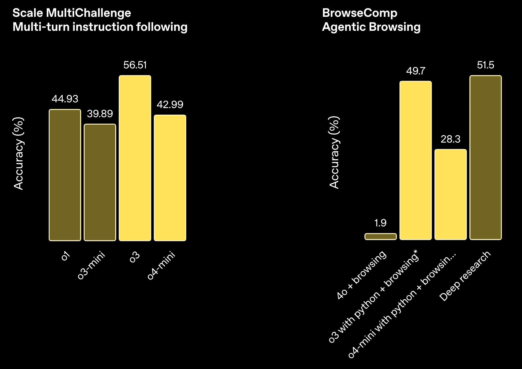 複数ターンにわたる複雑な指示への追従能力(Scale MultiChallenge)や、Webブラウジングを伴うタスク(BrowseComp)、APIのような関数呼び出し(Tau-bench)といった、エージェント的な能力を測るベンチマークでも評価が行われています。ツールを連携させる能力の向上が、これらのタスクにおける性能向上に寄与していると考えられます。