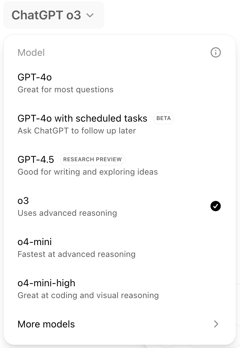 モデル選択: ChatGPT画面上部のモデルセレクターから "o3" または "o4-mini" を選択します。