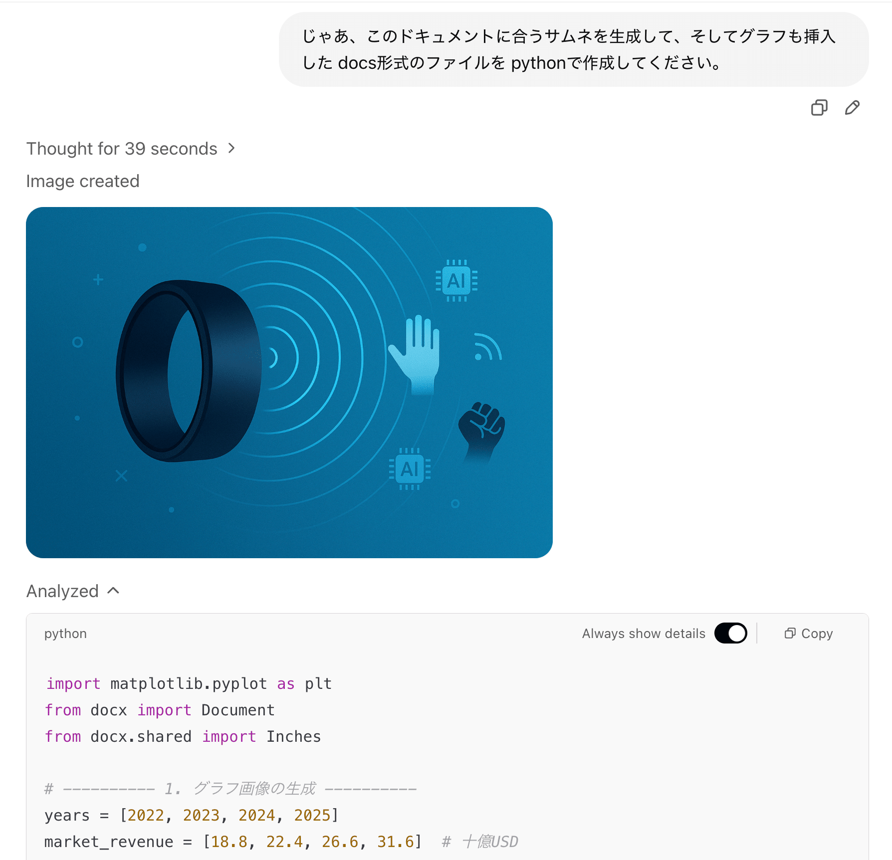 先ほどの会話の続きで、画像生成まで行い、それも含めたドキュメントの作成まで対応してくれました。