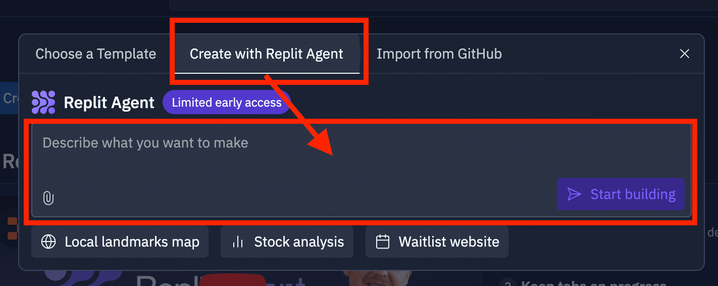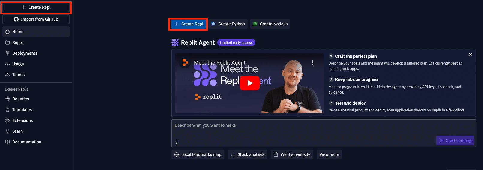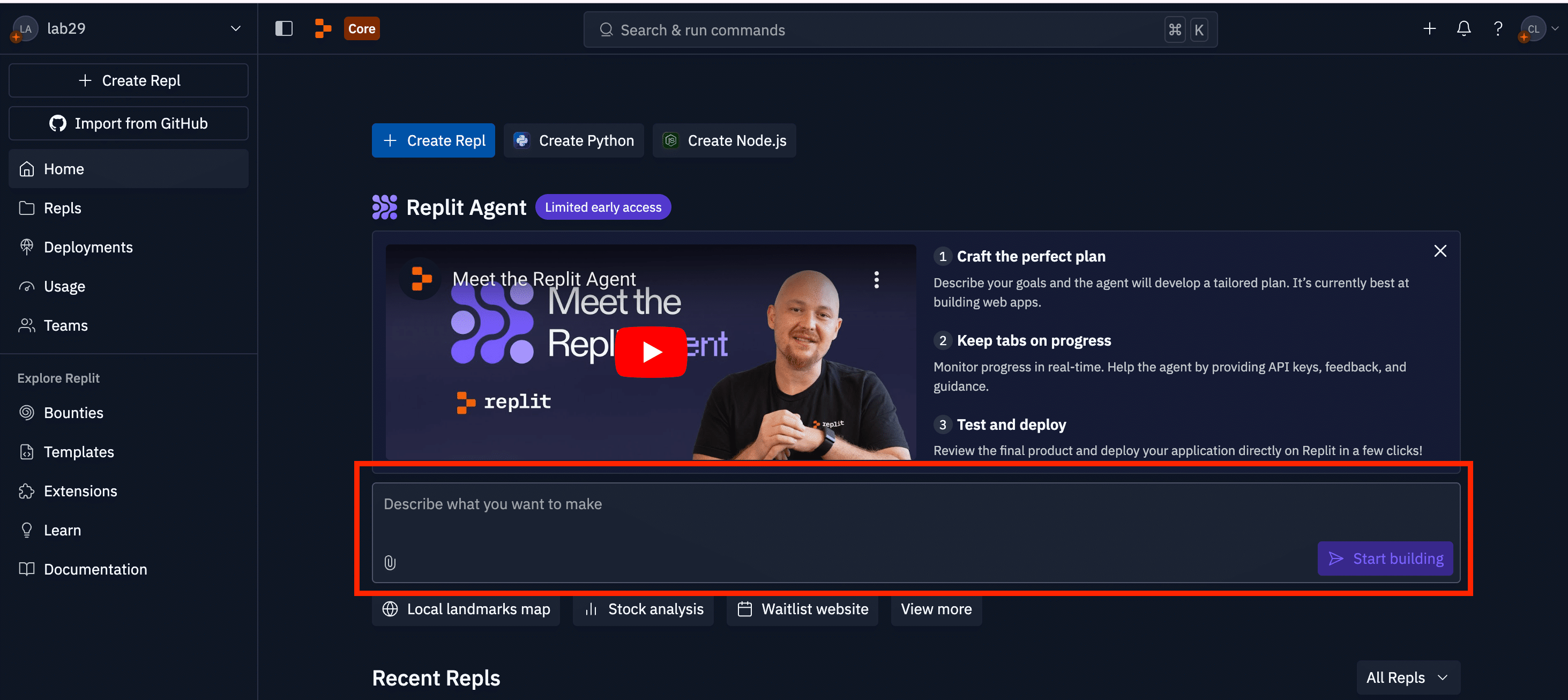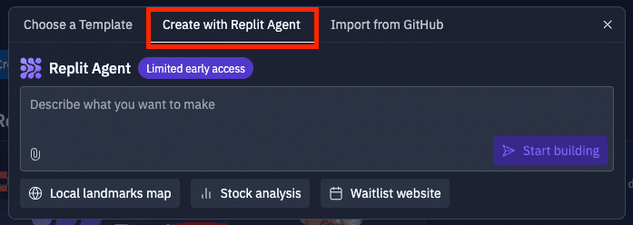まずは、Replitのホーム画面から、または「+ Create Repl」ボタンからReplit Agentを選択します。