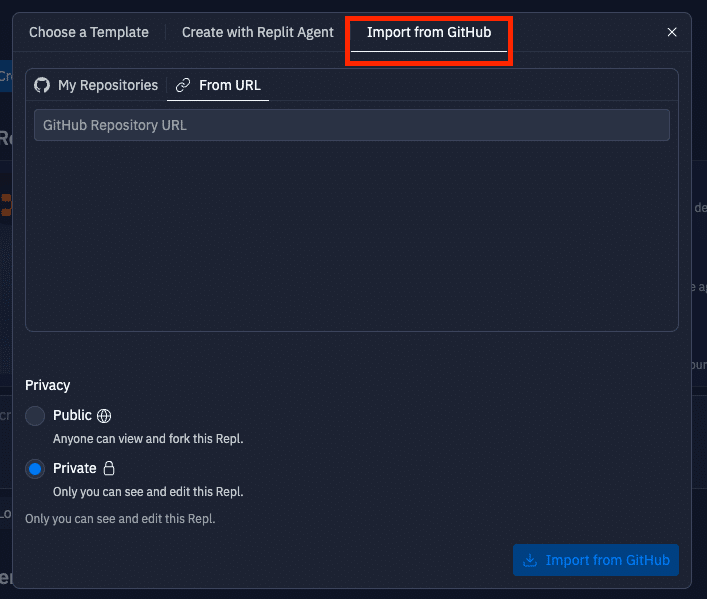 GitHub からインポート: 既存の GitHubリポジトリをインポートして Replitで開発を続けることもできます。