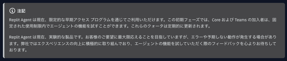 Replit Agentは現在、早期アクセス版として提供されており、Replit CoreまたはReplit Teamsの有料プランユーザーが利用できます。