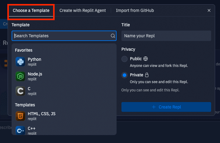 アカウント作成後、Replitのホームページに移動します。「+ Create Repl」ボタンをクリックすると、Replの作成画面が表示されます。