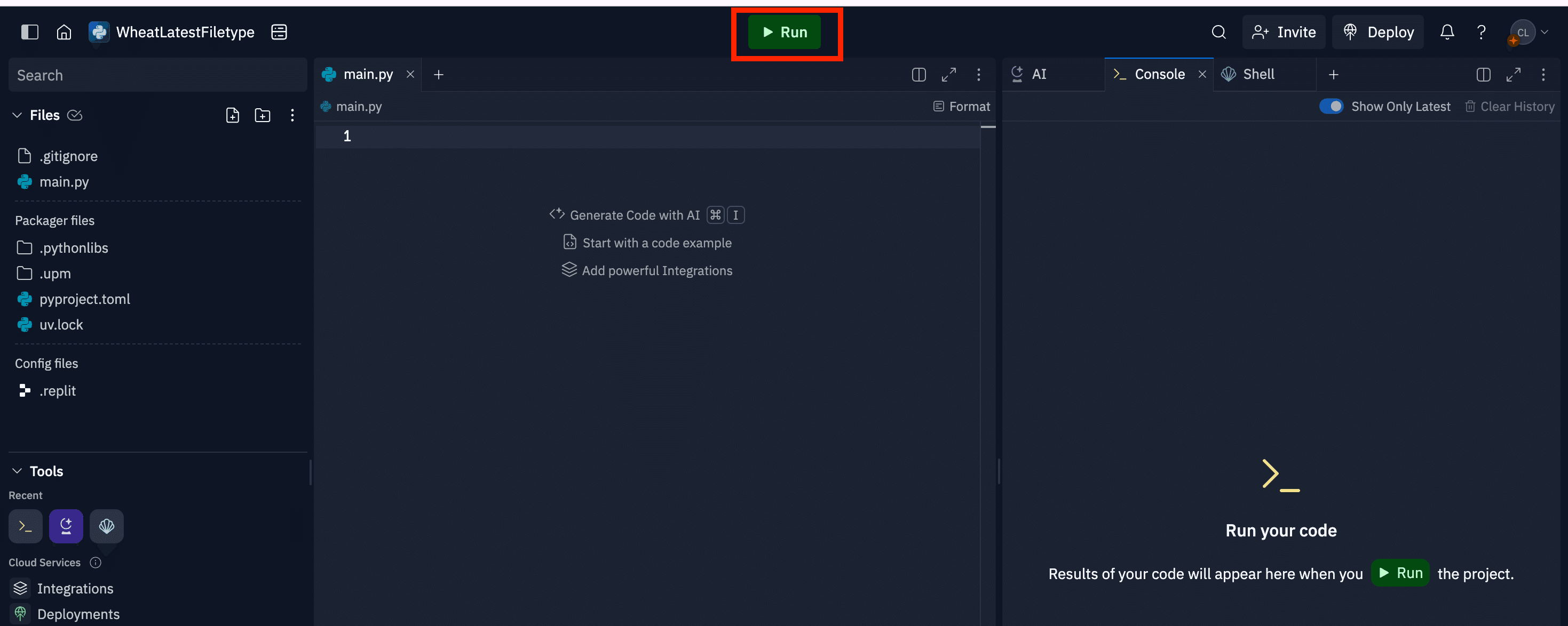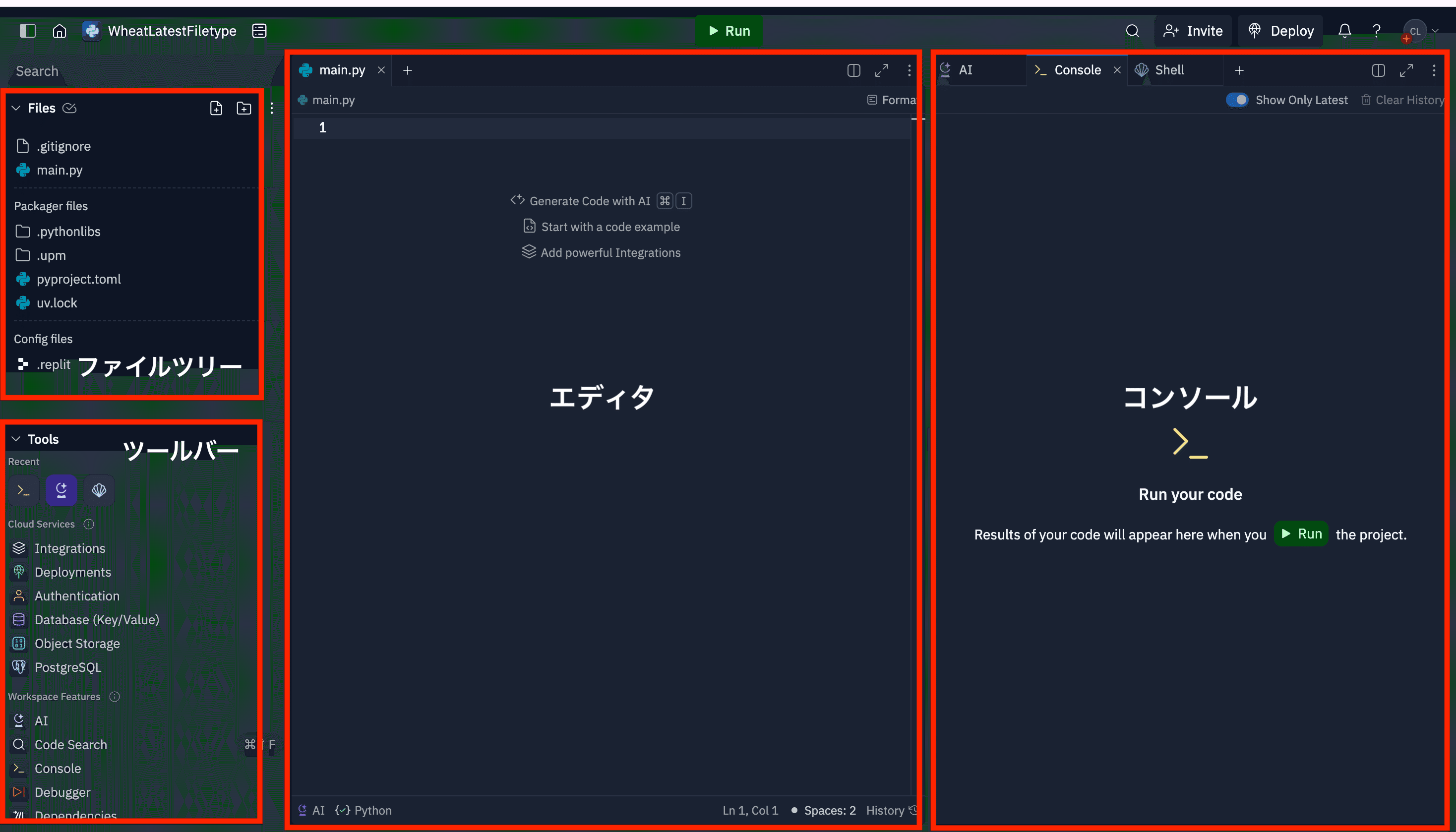 Replを作成すると、Replitのワークスペースが表示されます。ワークスペースは、主に以下のエリアで構成されています。