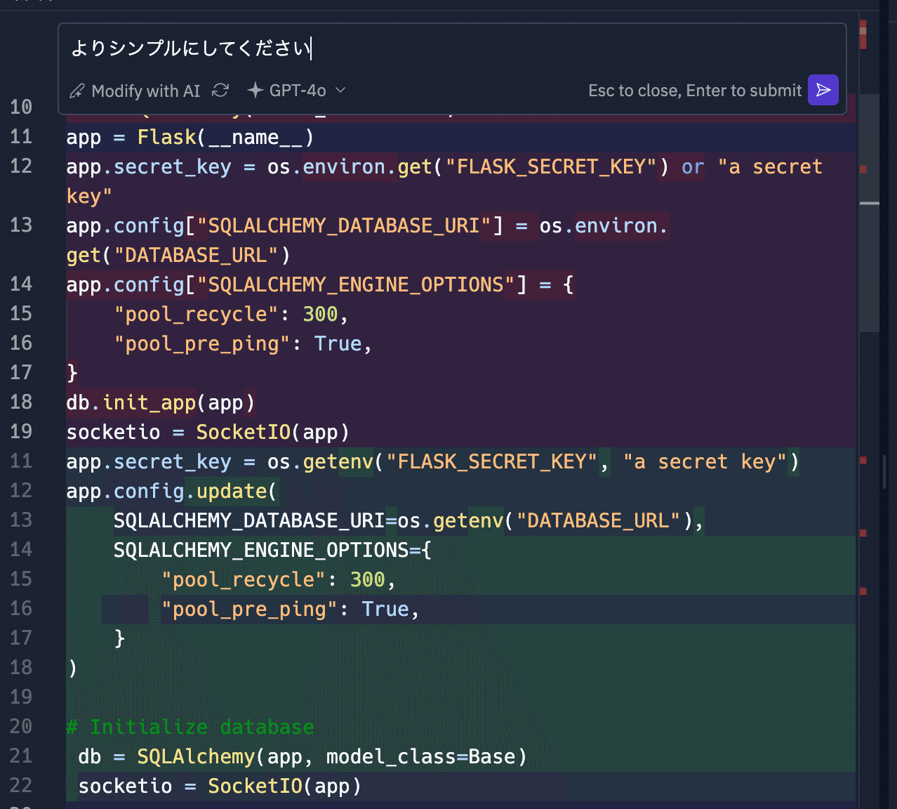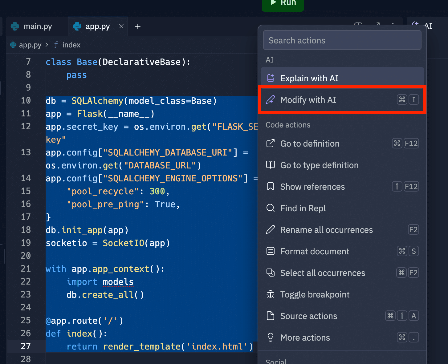コードを選択し、右クリックメニューから "Modify with AI" を選択すると、AI がコードの修正案を提案してくれます。