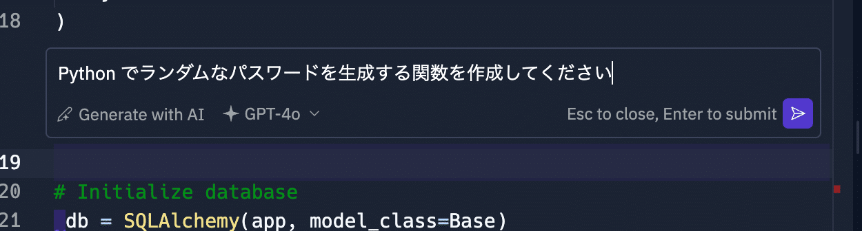 「Pythonでランダムなパスワードを生成する関数を作成してください」のように指示すれば、AIがそれに応じたコードを生成します。