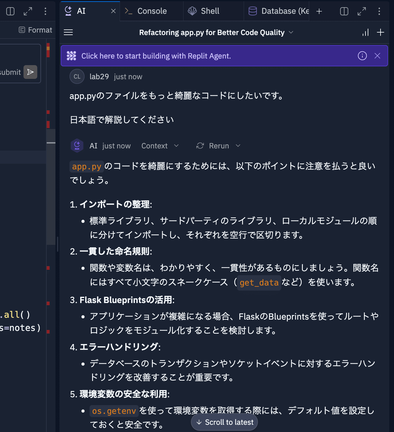 Replitの基本的な操作は以上です。これらの機能を使いこなすことで、効率的な開発ワークフローを構築できます。