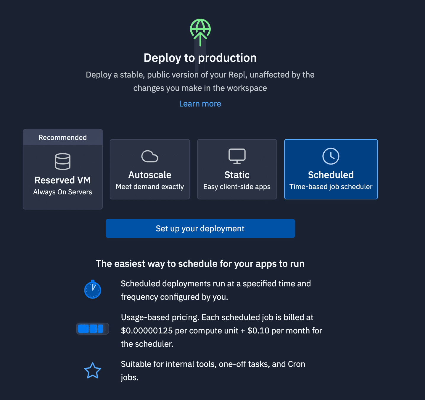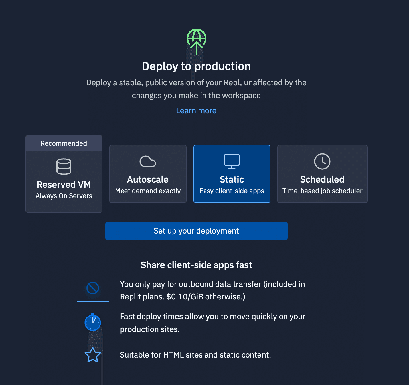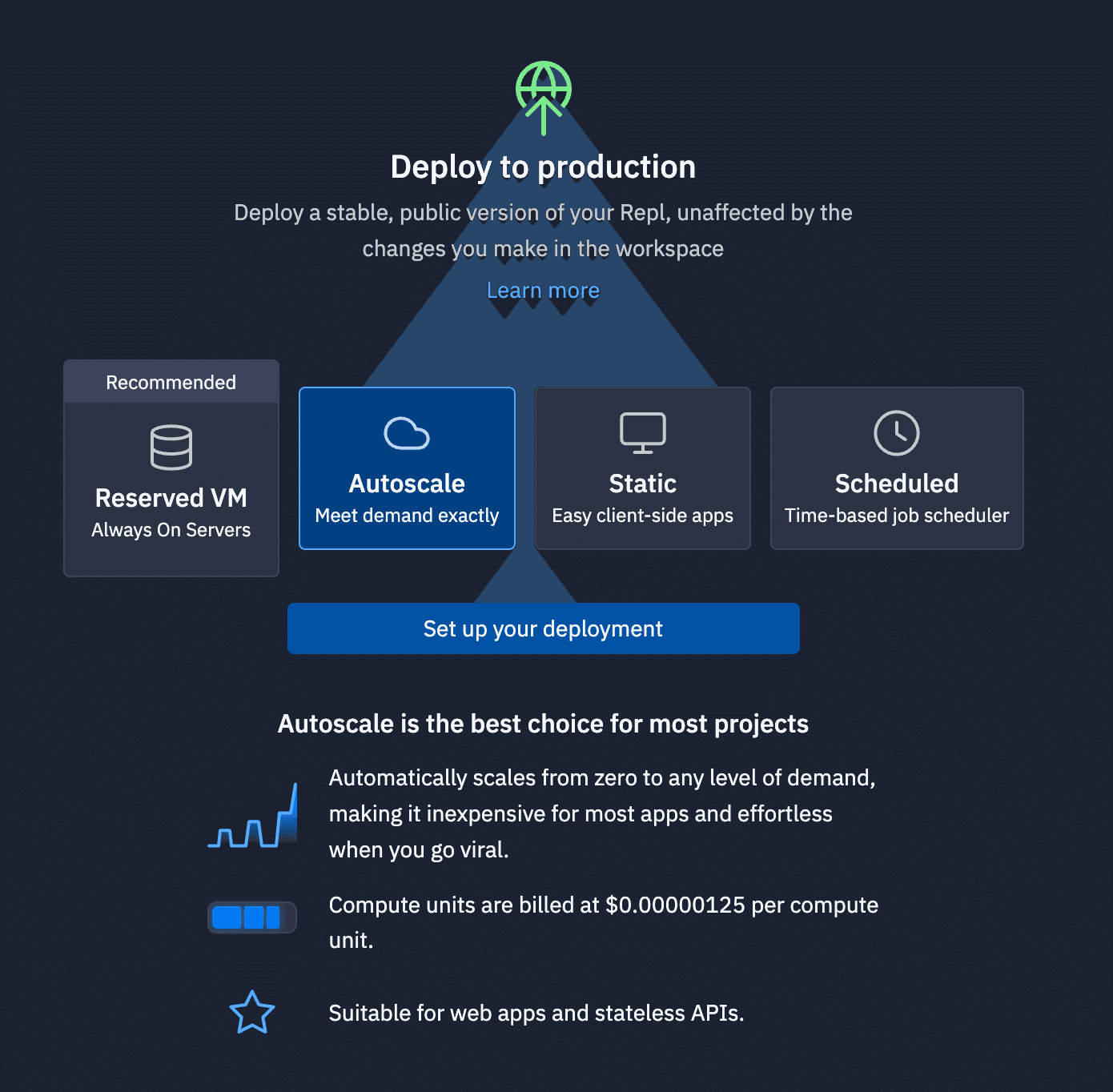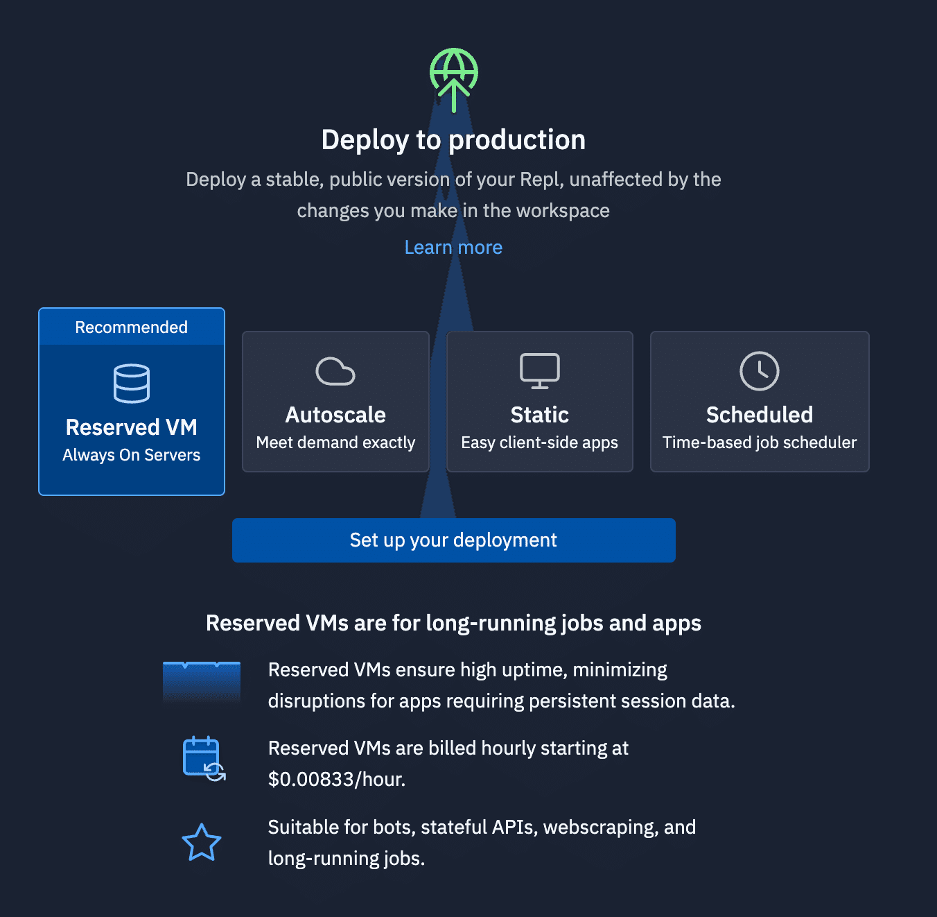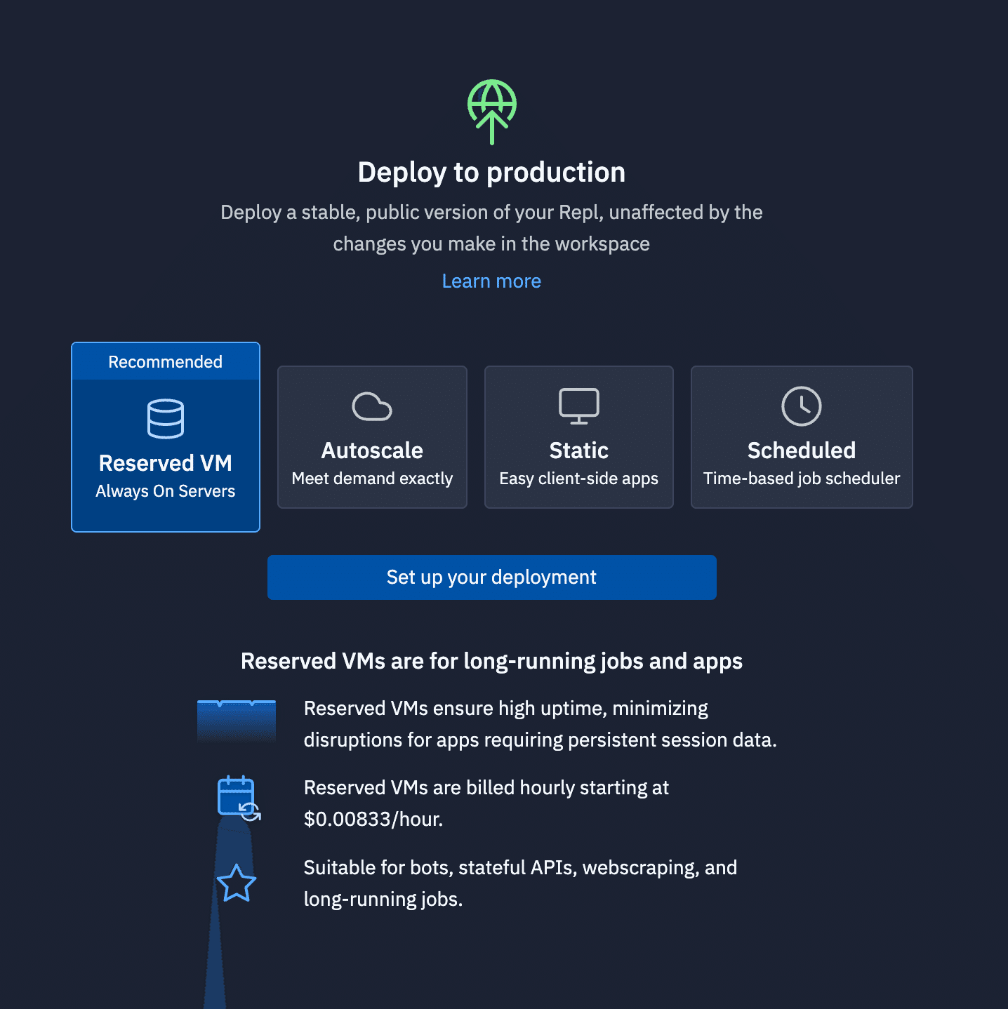 Replitでは、作成したアプリケーションを簡単に公開・共有するためのデプロイメント機能が提供されています。以下の4つのデプロイメント方法があります。