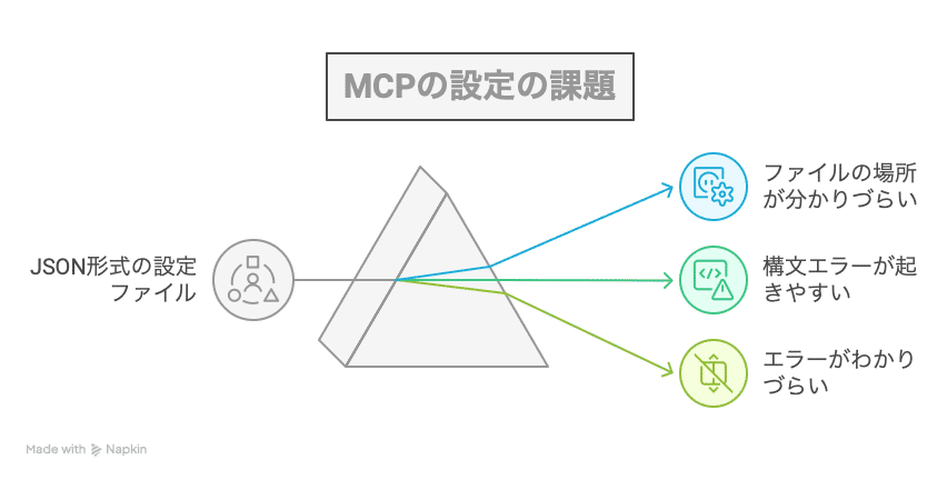 しかし、MCPの課題は設定が煩雑で、カンマやカッコなど1つないだけでも正常に動作しないというのが、とっつきづらい点でもありました。従来のMCPサーバーを使うためには、以下のような課題がありました。
